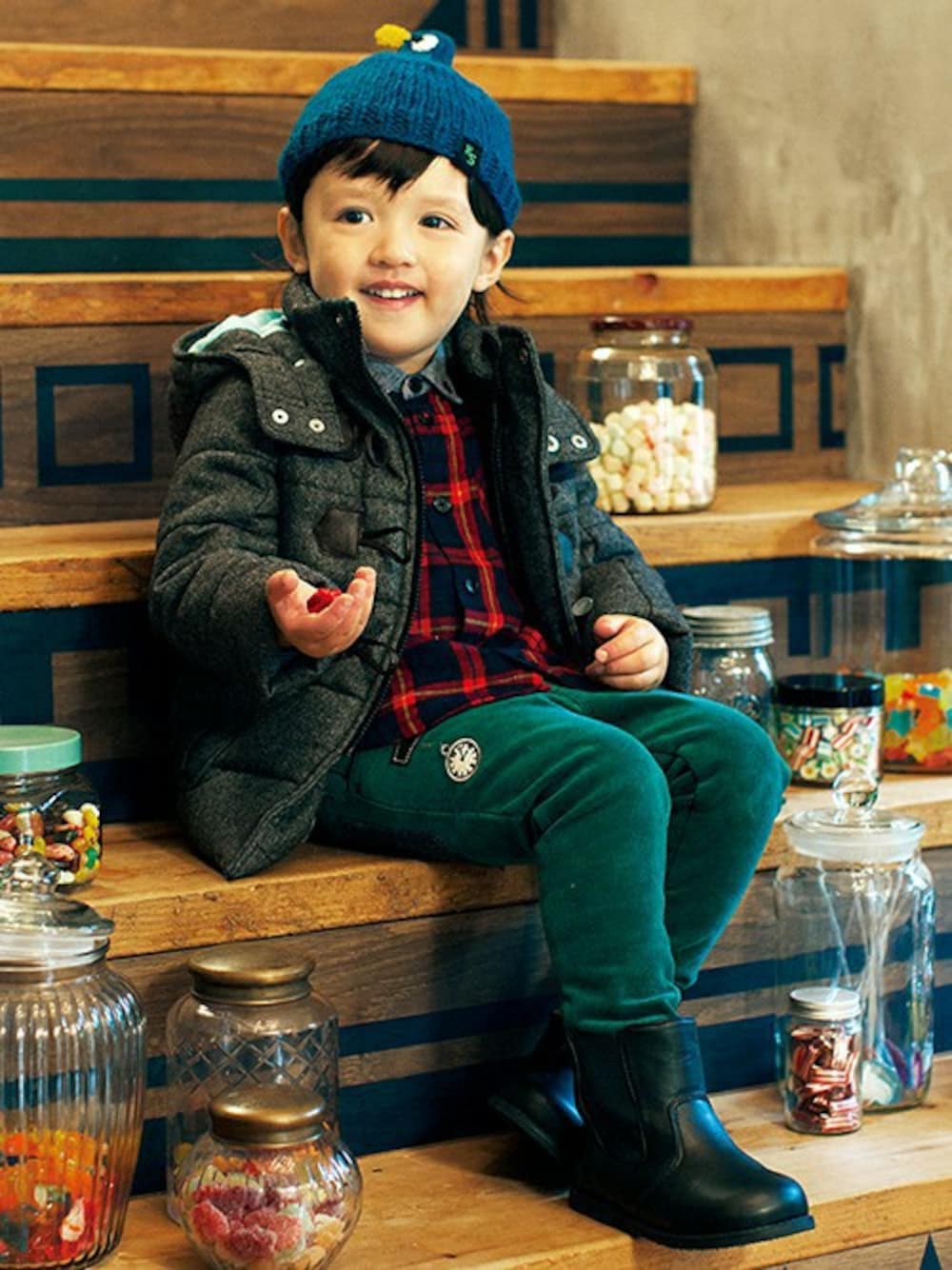 異なる素材と柄をミックス!冬のカジュアルコーデ ふっくらと暖かな中綿入りブルゾンは一見シンプルながらもディテールにこだわったアイテム。 フードは取外し可能。 チェック柄シャツはエルボーパッチにはヒゲさんや吹き出しをデザインしユニークなルックス。 発色の良いコーデュロイ生地のストレートパンツは裏起毛仕様。フラップから時計がしゃらっと垂れた遊び心あるトロンプルイユデザインがポイント♪ とりさんモチーフのニット帽でキュートなカジュアルコーデの完成!