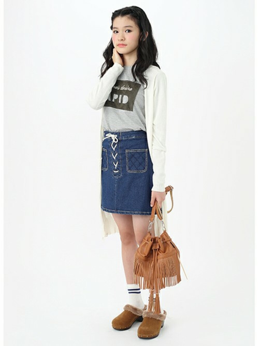 フェイクスウェードのアップリケが遊び心を感じさせる長袖Tシャツはソフトな生地をメインに用いて着心地抜群♪ ケーブルニットロングカーディガンは落ち感のあるドロップショルダーと袖口&裾の幅広リブ切り替えでメリハリフォルムをメイク☆ コンパクトな台形シルエットで大人っぽく仕上げたスカパンはコードをきゅっと編み上げたフロントのレースアップデザインがアクセント♪ 小物はフリンジバッグをチョイスしておでかけにピッタリの大人かわいいスタイリングが完成。