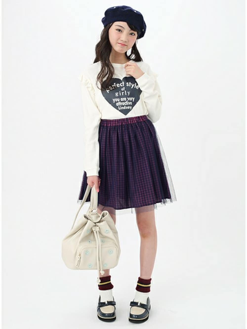 ロゴ入りのハートマークがSWEETに主張する長袖Tシャツは、肩の切り替え部分にフリルをあしらい、ふわふわと女の子らしい仕上がりに♪程良くゆとりのあるシルエットで、気負わず力を抜いて着こなせる1着です。 愛らしいお花モチーフをあしらった、ガーリームードただようバッグでスイートな女の子らしさをメイク。ストラップのつけ方次第で、ショルダーとしてもリュックとしても使える2WAY仕様♪内側はドット柄で切り替えて、見えない部分も女の子らしく仕上げています。 履き口に配色ラインを効かせて、スポーティーなエッセンスをプラスしたクルーソックスでアクティブさを、アッパーを彩るリボンモチーフは上品な甘さが好印象のメリハリある配色で存在感が際立つローファーで大人っぽさを演出♪