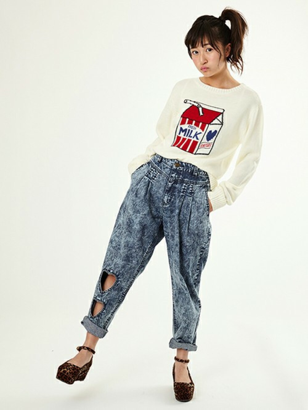ハートマークが可愛いMILKパッケージデザインのニットのパッケージにはさり気なくブランドロゴをオン♪ 程よくゆとりのあるシルエットで、リラックスして着こなせます。シャツをインして衿ぐりや裾からチラ見せしたレイヤードスタイルもおすすめ。 ハート形のキュートなカットワークが乙女心をくすぐるデニムパンツのタック入りのシルエットは、腰周りがゆったりとしていてはき心地良好♪ 深い色合いの紺とケミカルウォッシュタイプのマルチ、カラーによって表情が異なります。