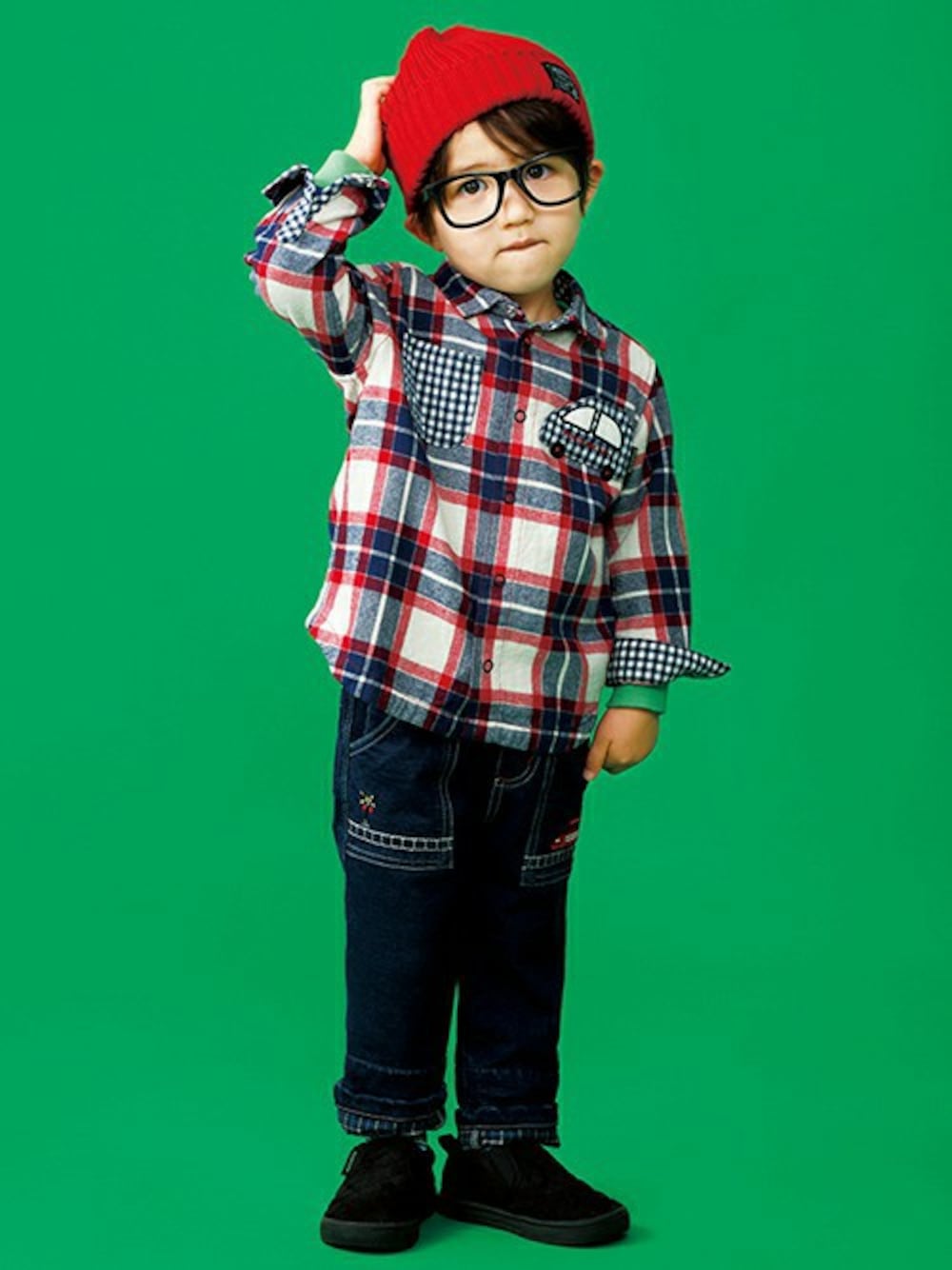 部分的にパターンの異なるチェック生地をミックスし表情豊かに仕上げたシャツは車をモチーフとしたキュートなポケットが目を引くアクセント♪センターや袖口には着脱しやすいスナップボタンを用いています。鮮やかな電車や線路の刺しゅうが目を引くデニムパンツは裾を折り上げればチェック柄が顔を出すおしゃれな1本♪ウエスト部分は伸縮性のあるリブで切り替えて、はき心地良く仕上げました。アジャスターゴムでウエスト調節可能です。落ち着いたカラーリングでシックに決まるスリッポンは紺は千鳥格子柄と無地の切り替えでメリハリ良くデザイン、黒は無地のキルティングと、内側にチェック柄を合わせ表情豊かにデザインしました。ロゴ入りタグがブランドをさり気なくアピールします。赤のニット帽でトップにアクセントを利かせてバランス◎