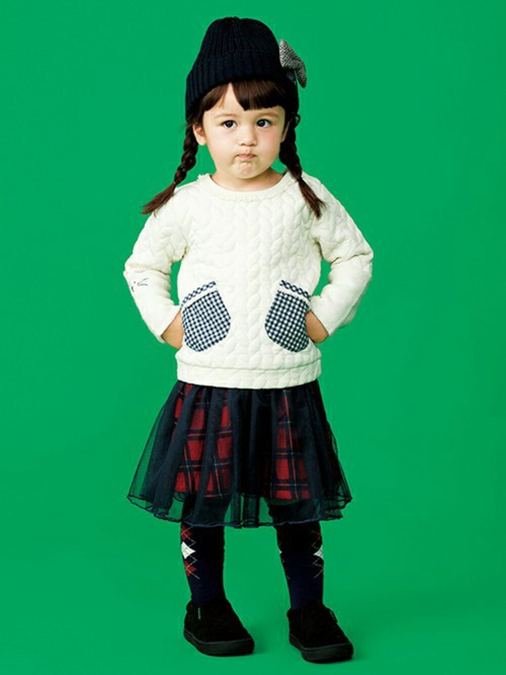 ほっこり感たっぷりのケーブル柄トレーナーは衿ぐりのレースやチェック柄のポケットがかわいいアクセント。異素材で切り替えた袖口は右側をネコフェイスデザインにしました。遊び心がつまったコーデの主役になるアイテム。※80、90サイズのみ肩開きです。チェック生地の上へ無地チュールをふわりと重ねてフェミニンに仕上げたスカートは程良いボリュームのギャザー入りシルエットながら、透け感のある風合いで重たいイメージにならないのが◎両サイドにポケットつきです。※アジャスターゴムでウエスト調節可能です。 アーガイル柄のハイソックスはトラディショナルで端正なコーディネートにしてくれるアイテム。足元とニットキャップで全体を締めシックな秋のガ―リーカジュアルの完成♪