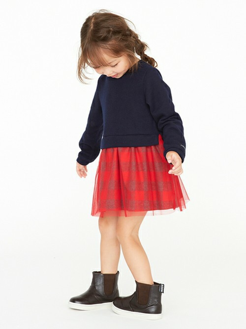 大人気!トップスを無地ニットソー、スカート部分をチェック&チュールで切り替えたコーディネート風ワンピース。ふんわりとしたボトムスデザインがキュート。スタイリングが即完成するので、ママにとってもうれしいアイテム。足元はゴツめのサイドゴアで甘辛バランスもバッチリ♪好評につき再入荷決定!数に限りがございますのでお早目にお買い求めください!