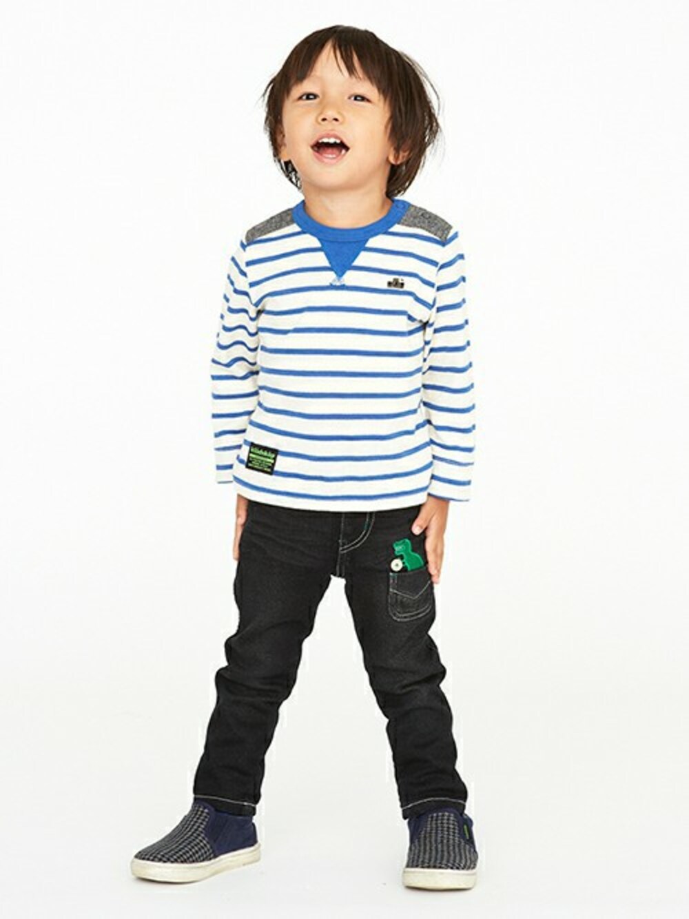 カメラモチーフのワンポイント刺しゅうがおしゃれ心をくすぐるTシャツはカジュアルライクなボーダーデザインでデイリーコーデに活躍する1着。別布で切り替えた肩も目を引くアクセント。袖口を折り上げてアレンジするのがおすすめ♪※80、90サイズのみ肩開きです。ポケットから顔を出すボタンを手にした恐竜の刺しゅうがチャーミングなスキニーパンツはデニム風の裏毛生地にヴィンテージライクな色落ちをほどこして、こなれた雰囲気ただようアイテム♪アジャスターゴムでウエスト調節可能です。落ち着いたカラーリングでシックに決まるスリッポンは、紺は千鳥格子柄と無地の切り替えでメリハリ良くデザイン、黒は無地のキルティングと、内側にチェック柄を合わせ表情豊かにデザインしました。ロゴ入りタグがブランドをさり気なくアピールします。