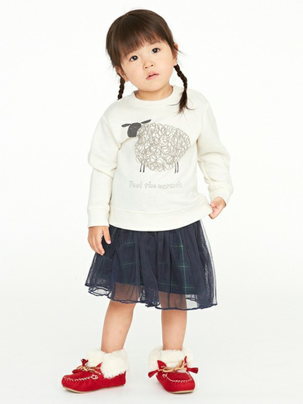 クレヨンで描いたようなヒツジの毛がチャーミングなプリント入り裏毛トレーナーはブランドをさりげなく印象づけるバックネックのロゴパッチがポイント♪クルーネックのベーシックなフォルムで、スタイリングしやすいアイテムです。※80、90サイズのみ肩開きです。チェック柄生地の上へ無地チュールをふわりと重ねて、フェミニンに仕上げたスカートは程良いボリュームのギャザー入りシルエットながら、透け感のある風合いで重たいイメージにならないのが◎両サイドにポケットつきです。※アジャスターゴムでウエスト調節可能です。足元はあたたかムートンブーツでもこもこかわいく。