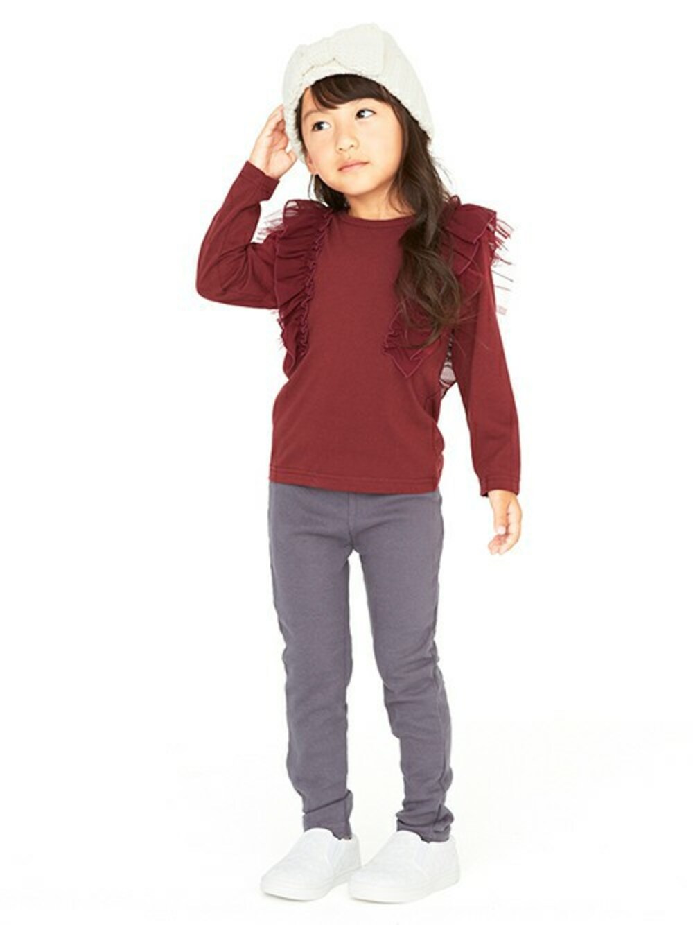シフォン×チュールのふわふわなフリルでSWEETに飾ったTシャツはb-room人気商品。パッと目を引く華やかなルックスがデイリーコーデをランクアップ!全体をワンカラーでまとめて、スタイリングしやすいのも魅力です。ボトムはデイリーに活躍するシンプルなストレートパンツ。パッチつきのバックポケットが後ろ姿のアクセントに。程よく伸縮性のある上質な日本製のフライス生地を使用し、ウエストは着脱しやすいゴム入りで動きやすく快適な穿き心地です。1着ではもちろん、レギンス感覚でスカートやショートパンツを重ねたレイヤードスタイルも◎リボンつきニット帽でかわいく仕上げて♪