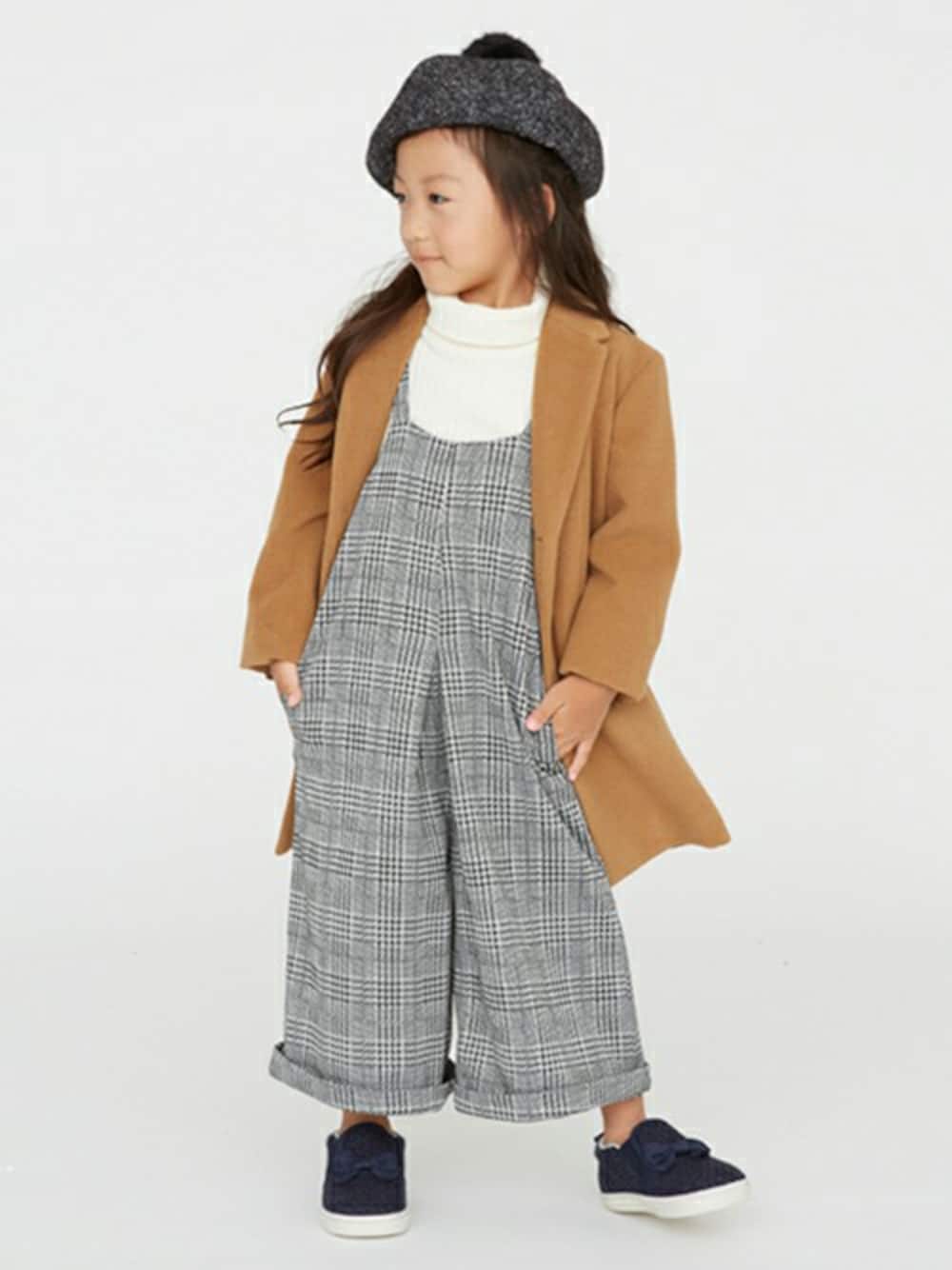 クラシカルなデザインでスタイルを上品にまとめ上げるメルトンチェスターコートはキャメル&グレーは無地、ブルーはチェック柄と、カラーによって異なるパターンを採用。キレイめな装いにはもちろん、カジュアルコーデにさらっと取り入れてもおしゃれです。インナーはスマートに決まるリブ編みのタートルネックカットソーです。装飾を省いたシンプルなルックスは幅広いコーディネートに着回せて◎ボトムはゆったりとしたワイドシルエットにリラックスムードがただようガウチョオーバーオールで。落ち着いた色合いの生地を採用しており、大人っぽく決まるアイテム♪紺はストライプ、黒&グレーはチェック柄と、カラーによって異なるパターンを採用しました。両サイドにポケットつき。素材感がスマートな印象のベレー帽でとびきりオシャレに!