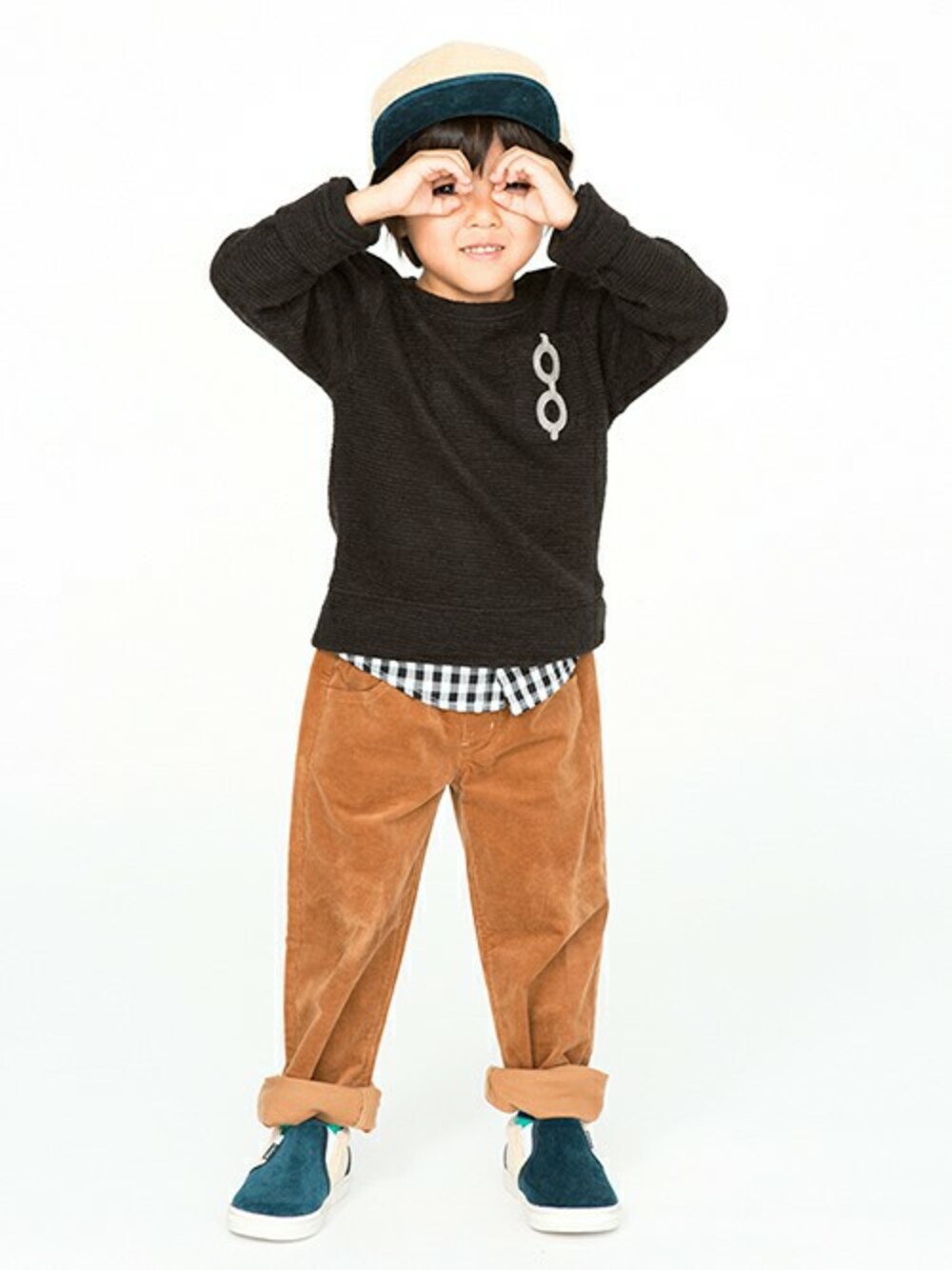 裾へチェック柄の別布を合わせた、レイヤード風デザインのニットソーはポケットにメガネを掛けているようなトロンプルイユが遊び心を感じさせる1着。背中へ掲げたNYCのロゴが、後ろ姿を印象的に演出します。※80、90サイズのみ肩開きです。ボトムは秋冬にぴったりなコーデュロイ素材のスリムパンツです。深みのある色でオシャレ度アップ♪前ポケットにほどこした刺しゅうがワンポイントです。ウエストはアジャスターゴム仕様なので、程よいサイズ感に調節できます。 キャップはコーデュロイならではの風合いがぬくもりを感じさせるメリハリある配色切り替えでコーデのポイントになるアイテム♪正面のロゴ刺しゅうが目を引きます。頭周りはバックのバンドでサイズ調節が可能です。
