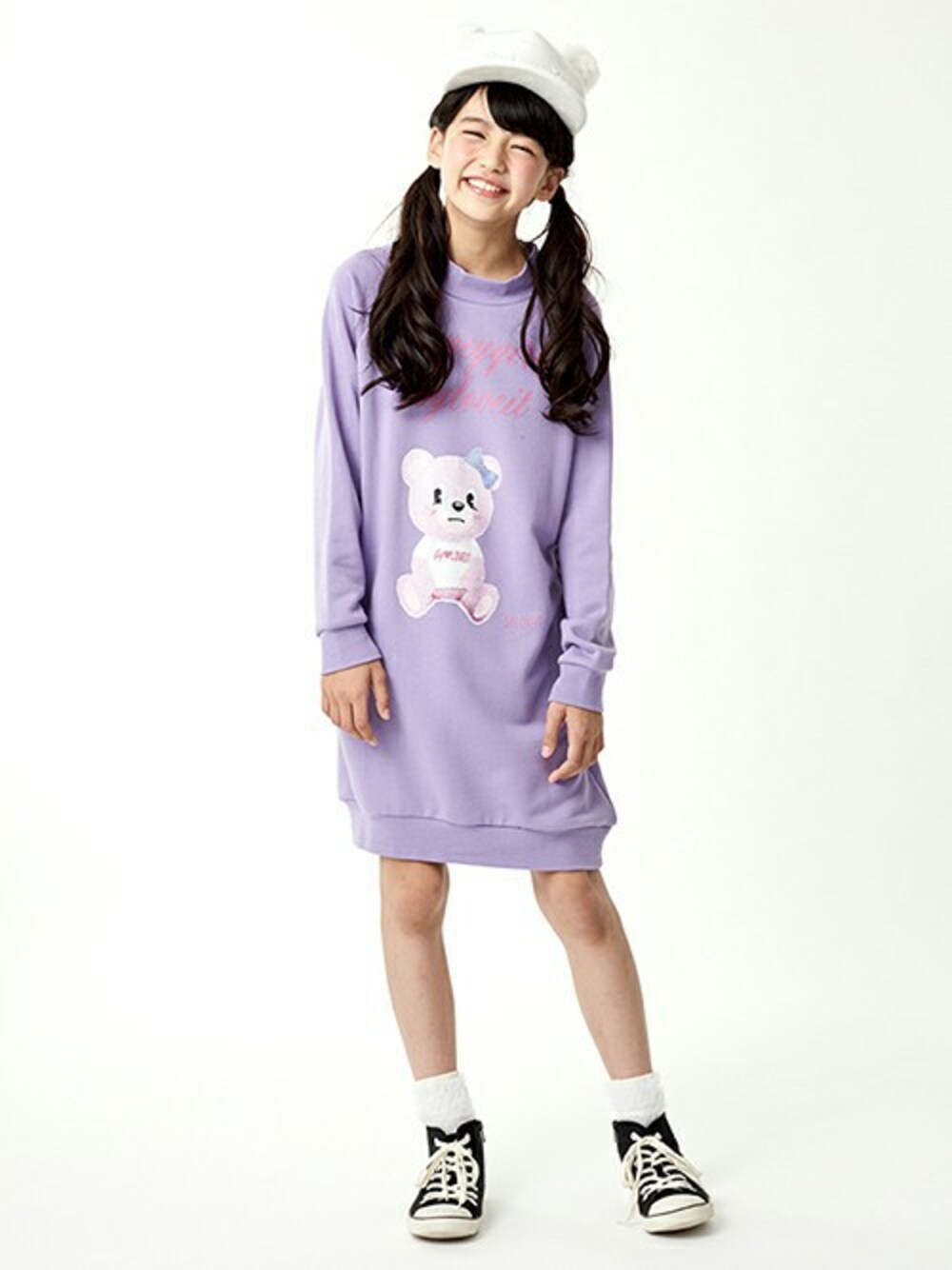 ふわふわなポンポンでキュートに飾ったキャップのアニマルの耳を思わせるラブリーなデザインは、コーデのアクセントとして大活躍♪ 本体と同色の糸でフロントにロゴ刺しゅうをほどこし、ブランドをさりげなく際立てました。頭周りはバックのバンドでサイズ調節が可能。 流れるようなロゴと愛らしいベアをプリントしたキュートで存在感あふれる裏毛ワンピースは、首元を適度におおうハイネックデザインにお上品さが薫る1着♪ ボディをゆったりと包むシルエットで、ラクチンに過ごせます。両サイドにポケットつきです。 もこもこのフェイクファーがフェミニンな印象を与えるソックスのはき口後にあしらった本体と同色のリボンは、ほんのり甘さのただようアクセント♪ 足裏部分は別生地で切り替えているので、シューズもすっきりとはけます。 足元をスマートに演出するハイカットタイプのスニーカーもサイドのグラフィカルなロゴがブランドをセンス良く際立てる1足♪ 側面をファスナーで開閉できる仕様なので、靴ヒモを都度結んだり外したりする手間が省けて◎。取り入れやすいベーシックなカラーは、様々なスタイルで活躍します。