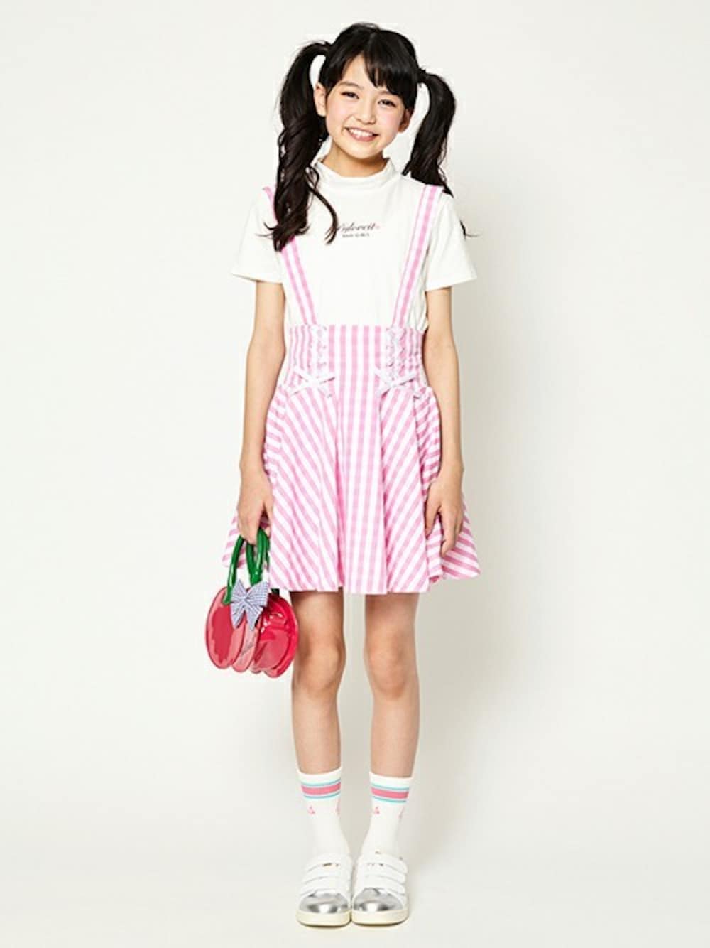 首元を適度におおうハイネックタイプで上品に着こなせるTシャツは、ブランドをおしゃれに印象づけるクラシカルな書体のロゴがポイント♪ 細身のシルエットでジャケットなどのインナーとしても重宝します。 ウエストにあしらったレースアップがガーリー気分を盛り上げるギンガムチェックジャンパースカートの裾にはロゴワッペンをプラスしブランドをさり気なくアピール♪ ふんわり広がるシルエットが女の子らしさを惹き立てます。ストラップを取り外してスカート単体としても着用可能。両サイドにポケットつきです。ウエスト後はシャーリング仕様。 リブ状の編地に配色ラインを効かせてスポーティーに仕上げたソックスも、ポップ感ただようブランドロゴも目を引く良いアクセント♪ くしゅくしゅっとたるませて、ちょっぴりルーズにスタイリングしてもかわいい1足です。 チェリーモチーフの本体にギンガムチェック柄リボンをあしらいスウィートムード満点に仕上げたバッグのショルダー用のチェーンストラップはお好みで取り外せる仕様となっており、コーデに合わせてアレンジできるのが◎。スタイルのアクセントとして存在感を放つアイテムです。