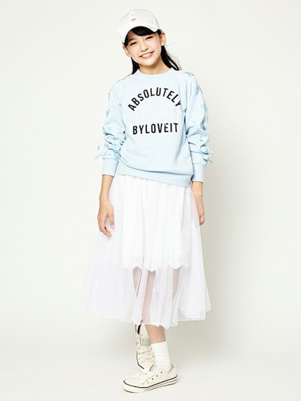ツヤやかなサテン仕立てで、コーデを華やかに盛り上げるキャップは、フロントのスウィートなカップケーキ刺しゅうが乙女心にヒット♪ バックへリボンモチーフを配しており、後ろ姿もかわいく決まります。コーデのアクセントとして存在感を放つアイテム。バックリボン部分にゴムがほどこされ、頭周りに程よくフィットする仕様です。 ほんのりと光沢のある刺しゅうが目を引く裏毛トレーナーの腕にはリボンのレースアップをデザインしてフェミニンなアクセントに♪ 後の裾部分にほどこされたロゴプリントがブランドをさり気なくアピールします。 カットワーク刺しゅう入りのレース生地に軽やかなチュール素材をふわりと重ねたスカートは、女の子らしいロマンティックなデザインで、コーデに甘いムードをもたらすアイテム♪ 上部へリボンモチーフをあしらい、細部まで愛らしい仕上がりに。ウエストゴム入りです。 上部へロゴ刺しゅうをほどこしてブランドらしいアクセントを添えたクルーソックスも、やわらかな光沢を放つパール調モチーフがスタイルを華やかに演出♪ 目を引く存在感で、コーディネートのポイントになるアイテムです。