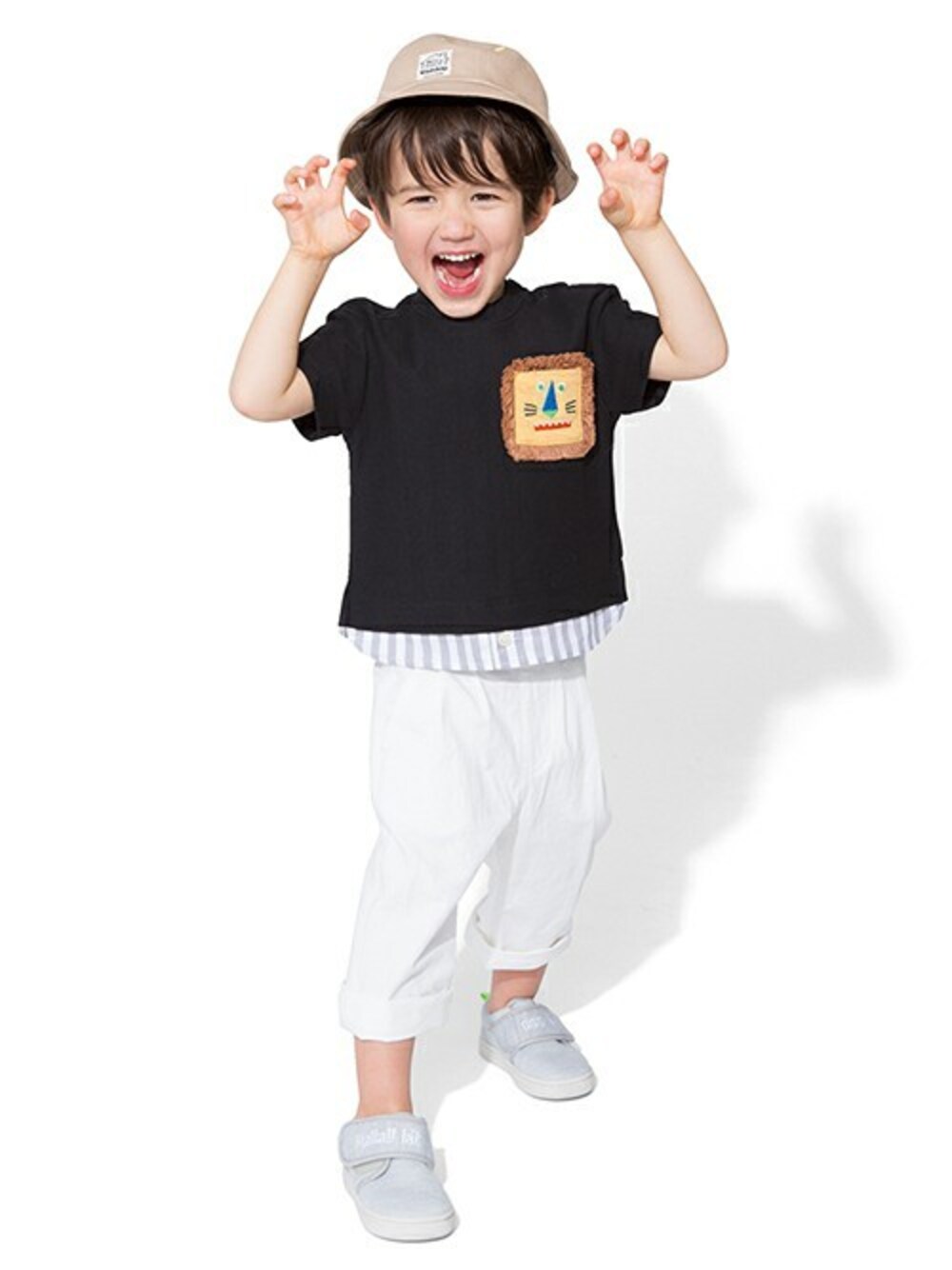 ふさふさとしたフリンジのたてがみが印象的な、ライオンポケットつきのTシャツは裾からストライプ柄の別布をのぞかせた、レイヤード風デザインがワザあり♪ シンプルなボトムスを合わせるだけで、おしゃれなコーデが完成します。※80、90サイズのみ肩開きです。ボトムはタックで腰周りにゆとりを持たせて、はき心地良く仕上げたパンツです。ブランドをさりげなく印象づける、バックポケットのロゴ刺しゅうがポイント♪オフホワイトは無地、紺はヴィンテージ風デニム、チャコールはストライプ柄と、カラーによってパターンや素材感が異なります。※アジャスターゴムでウエスト調節可能です。足元は配色のロゴ刺しゅうが目を引くスリッポンです。本体部分に編地を用いた、カジュアル感あふれるルックスが魅力♪バックに伸びるカラーテープも良いアクセントに。アッパーのバンドは面ファスナー式となっており、簡単にサイズ調節できるのがうれしいポイントです。日差しが強くなるこれからのシーズンにはハットも欠かせないアイテム。パッチがワンポイントのスタンダードなハットで熱中症予防もバッチリ!