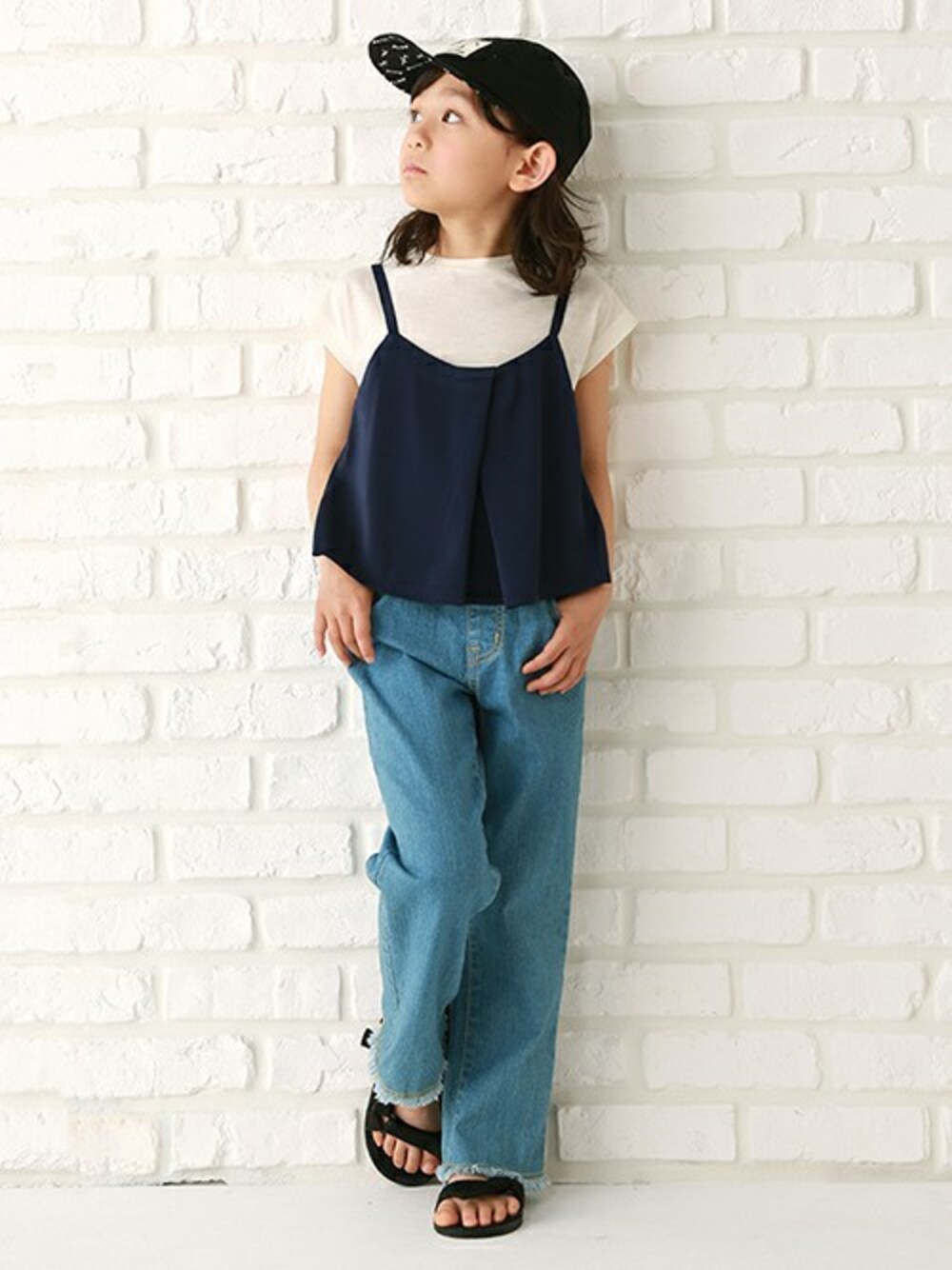 シンプルな無地デザインで、大人っぽいレイヤードコーデを楽しめるセットアイテムです。タックでシルエットに程良い広がりを持たせたキャミソールは、女の子らしさが薫る仕上がり♪ Tシャツはコンパクトなフレンチスリーブがフェミニンに見せるポイントです。ボトムはカットオフしてワイルドな表情をプラスしたデニムパンツです。ブランドをさりげなく印象づける、バックポケットのロゴ刺しゅうがポイント♪ さまざまなトップスとバランスを取りやすいストレートシルエットで、デイリーコーデに活躍します。内側にお名前を記入できるタグつき。※アジャスターゴムでウエスト調節可能です。サイズ調節がカンタンにできる、面ファスナー式のバンドを用いたコンフォートサンダルです。シンプルなデザインで、様々なスタイルにマッチするアイテム♪ 汚れが目立ちにくい、ダークカラーのソールもポイントです。