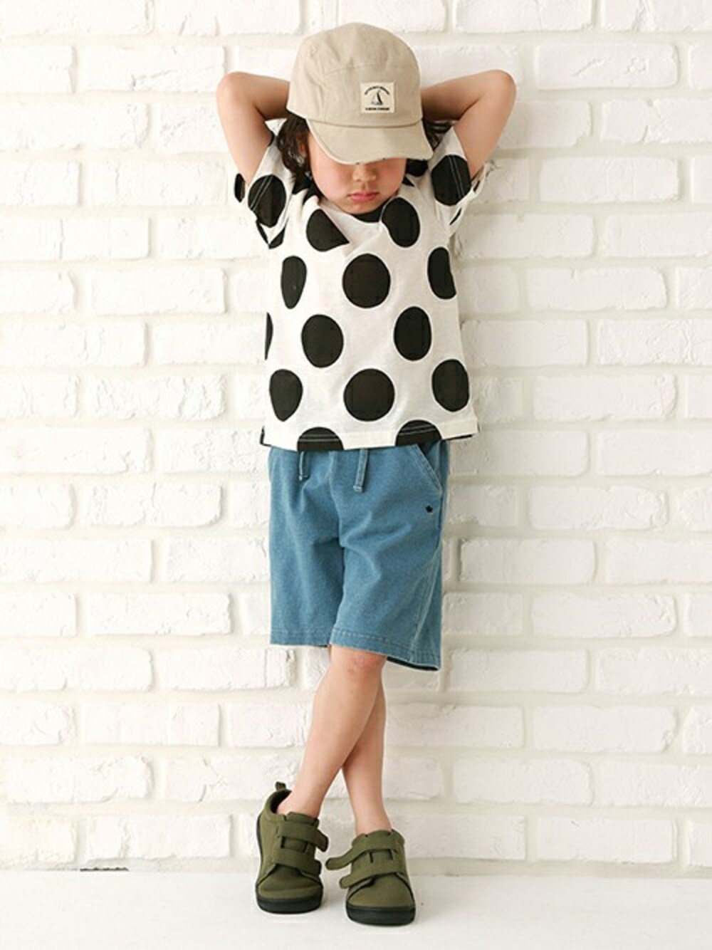 存在感のある総柄デザインのTシャツです。スタイルをオシャレに見せてくれる、デイリーユースに活躍するアイテムです! アイボリーはドット、黒はチェック、チャコールはクロス、ディープグレーはストライプと、カラーによって異なるパターンを採用。内側にお名前を記入できるタグつきです。※80、90サイズのみ肩開きです。ボトムははき込んだような色落ち感でこなれた雰囲気に仕上げたショートパンツです。小さなスターモチーフをトッピングしてさりげないアクセントにしました♪ ストレッチの効いたアクティブに過ごせるアイテムです。ウエストのリボンコードは飾り。内側にお名前を記入できるタグつきです。足元は面ファスナー式のバンドをアッパーへ2本あしらい、クールなルックスに仕上げたスニーカーです。サラッとしたカジュアルな素材感で、デイリーコーデに活躍するアイテム♪ はき口後ろ側に持ち手がついているのもうれしいポイント。