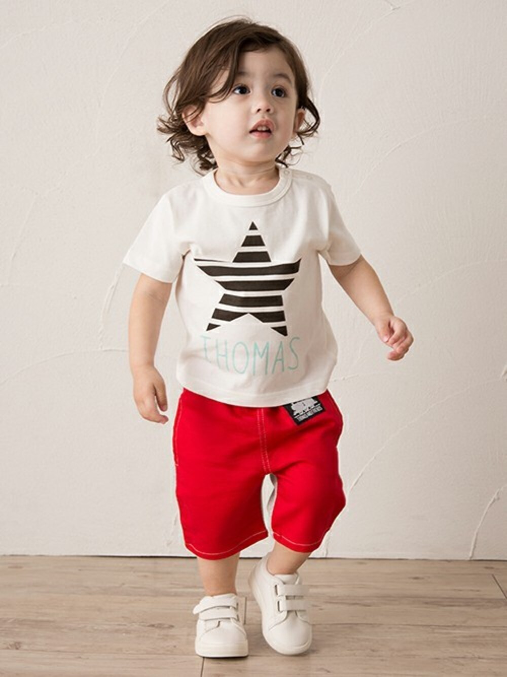 フロントのボーダー柄スタープリントがポップに主張するTシャツで、バックにもきかんしゃトーマスをデザインしてます。 パンツは前後で配色を切り替えたメリハリあるルックスがポイント!