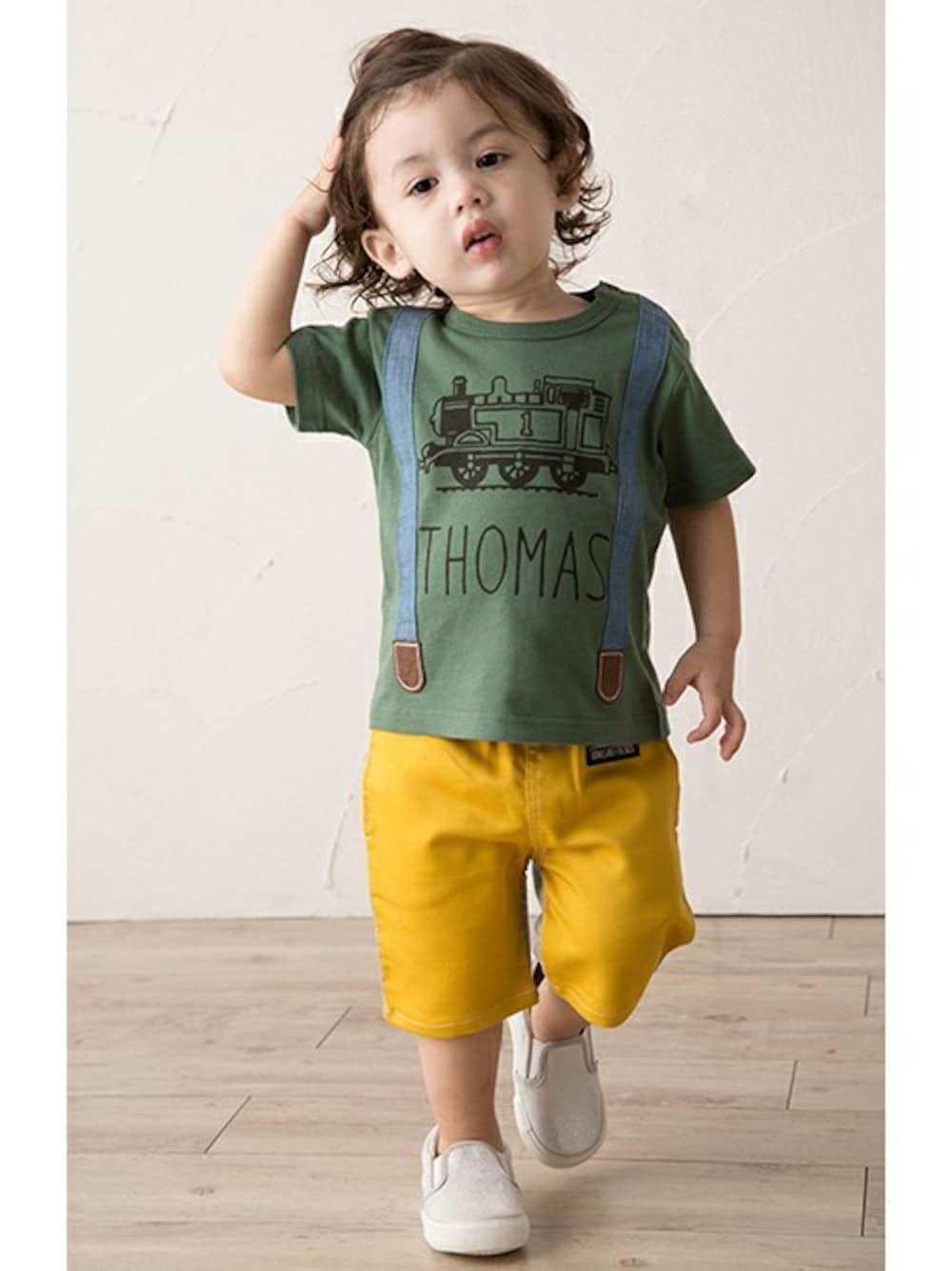 サスペンダーを合わせている様なフェイクデザインに遊び心が光る、きかんしゃトーマスのコラボTシャツで、フロントにほどこしたトーマス&ロゴプリントが目を引くポイント。 パンツは、前後で配色を切り替えたメリハリあるルックスがポイント!!