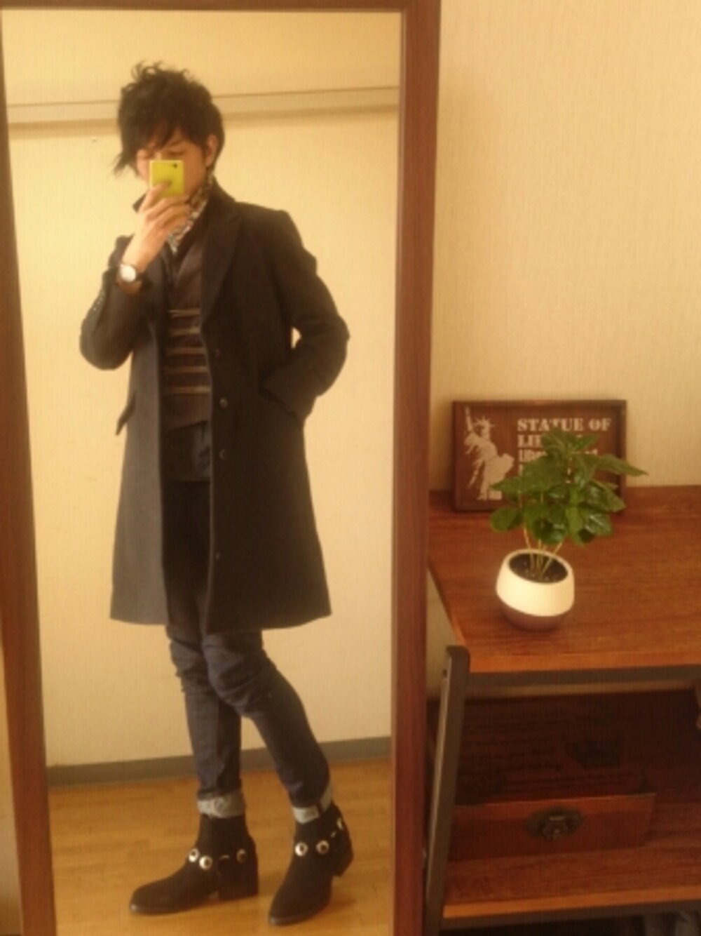 おはようございます☀ 12月に入って寒いのかと思ったらそうでもない💦 警戒し過ぎて着込みすぎる💦(´・ω・`)💦 チェスターコートスタイル🎵チャコールで✨ このチェスターコート買うと、nanoのハンガーまでついている⊂(^(工)^)⊃✨ 逆にハンガーが欲しければチェスターコートを買えばいいのです😆✨笑 高いハンガー😆✨ 足元はCAMINANDOのブーツ👢 中は黒シャツにグレーのベストでタブロイドニュースのストール☝ 暑すぎる💦 みなさん良い休日を✨