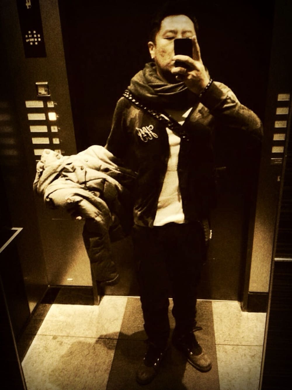 少々見辛いですが、グレー系で統一。白タンクトップにグレー迷彩カーディガン、グレー系カーゴ、足元はブッテロのレースアップブーツ、青みがかったグレー。肩掛けしている鞄は黒でタッセルが付いています。屋内では薄着、屋外ではグルノーブルのダウン着用です。首元はアメアパのブルースヌードを差し色で。