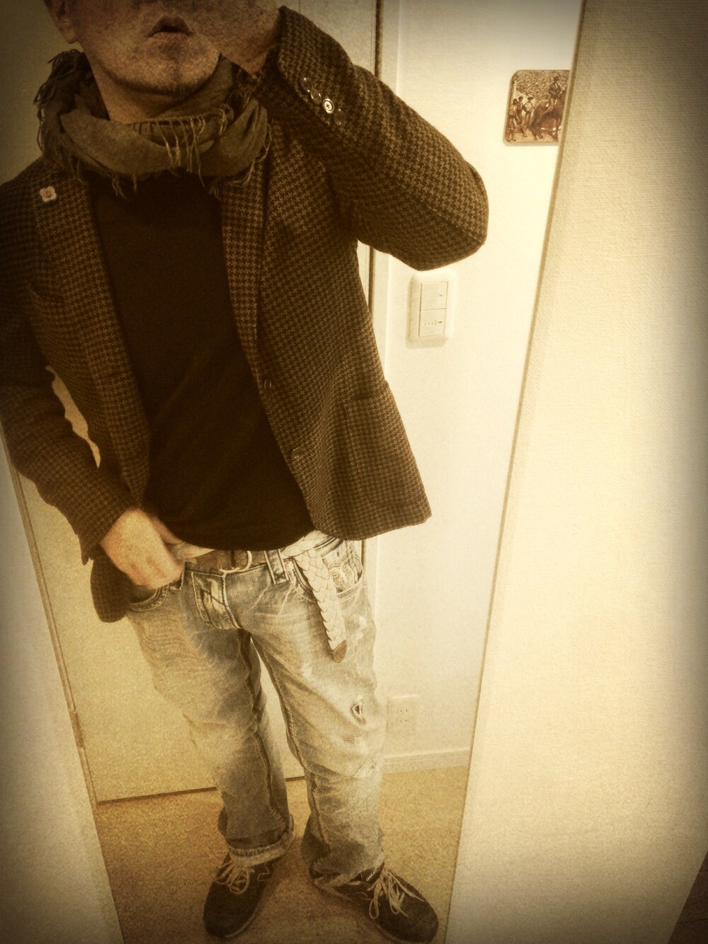 ボリオリジャケットの着崩しね。グリーン×ネイビーのニットに千鳥格子のジャケット、ダメージデニムにスニーカー、ボロいフリンジ付きのストールぐるぐる。