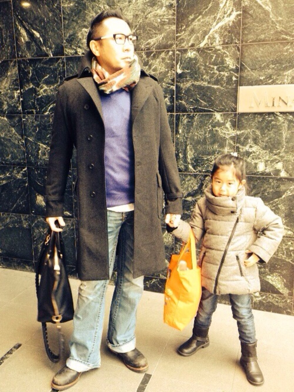 娘、エンジニアブーツ購入してウキウキ。それに付き合わされてペアルック^ ^ エンジニア、デニム、白シャツ、青ニット、アウターはグレー^ ^