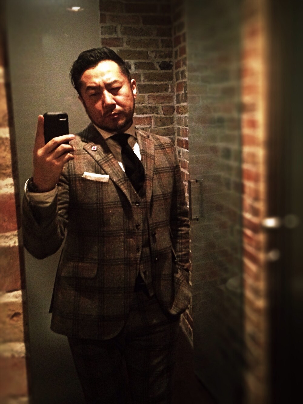チェックスリーピース。日本人らしからぬスーツ。ガキの頃は着こなせなかったね。こんなの。