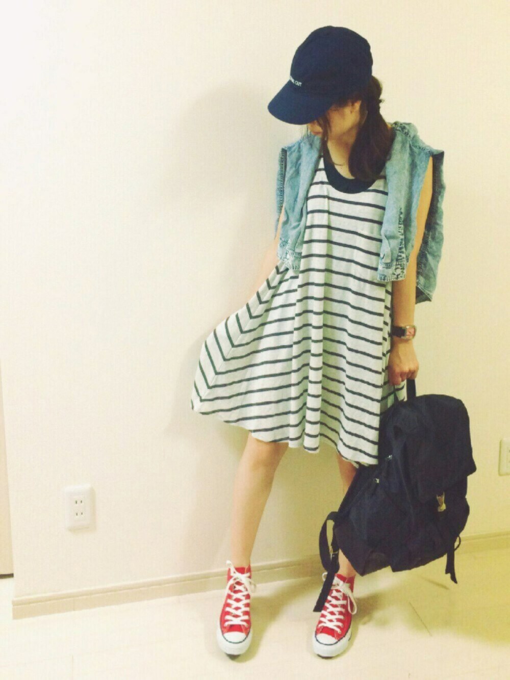 こんばんはー✨ いつもいいね❤️、SAVE、フォローありがとうございます😚💕 昨日と打って変わって、スポーティでカジュアルな休日コーデ😁🎵 アングリッドのワンピは同じ柄のタンクトップと散々迷って買ったもの🙋 夕方は少し涼しくなる+二の腕隠しでデニシャツを羽織ってます😂😂😂 二の腕なんとかしたいーーー😭