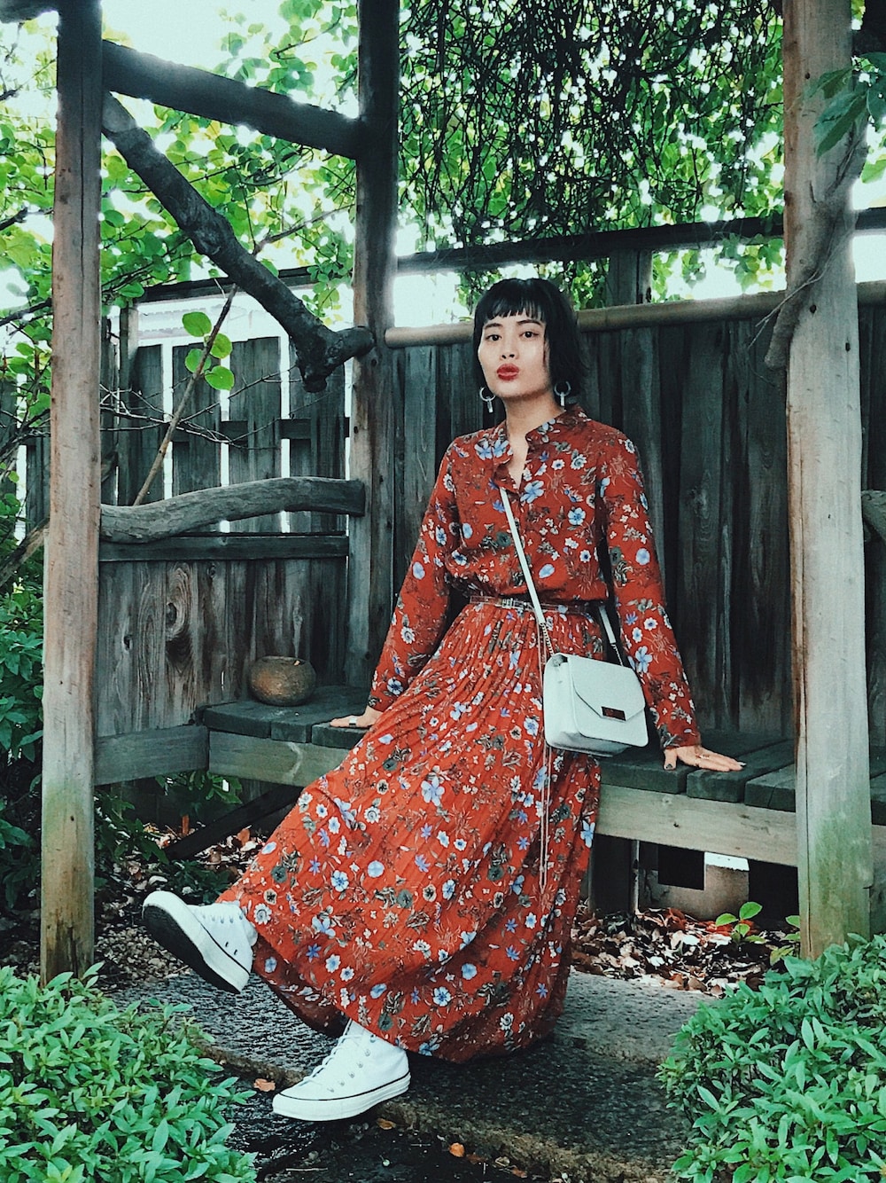 T Λ Eのワンピース「フラワーパターンプリーツロングワンピース」を使ったコーディネート