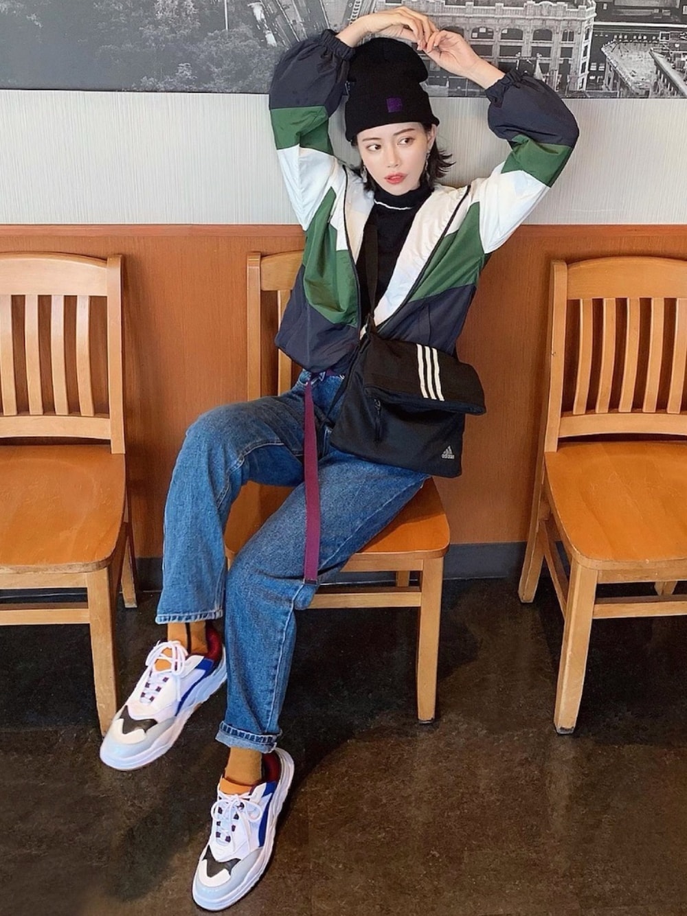 だいすきなスポーツMIX⚽️ マウンテンパーカーの 配色がお気に入り! moussy✖︎adidas の、 コラボサコッシュと 合わせてみました♥︎ 📲Instagram : tae_624