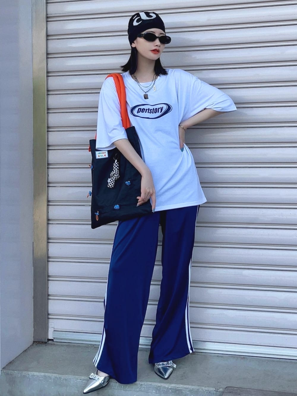 暑いのでTシャツ1枚で。 珍しくパンプスで合わせました❕ 今日は、 TAE×CHICKコラボの 新作バッグでアクセントを🧡💙 荷物たっぷり入るから かなりお気に入り( ◠‿◠ )