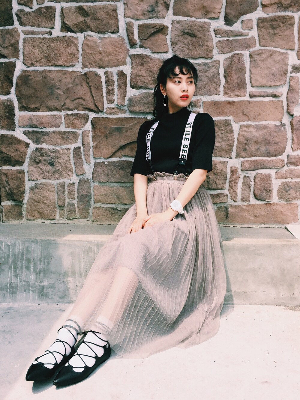 久しぶりにサスペンダーつけてみた👀💓💓 これは古着屋さんでgetしたよぉ〜! ひらひらふんわりスカートお気に入り♡ レースアップシューズとソックスの合わせもスキー!
