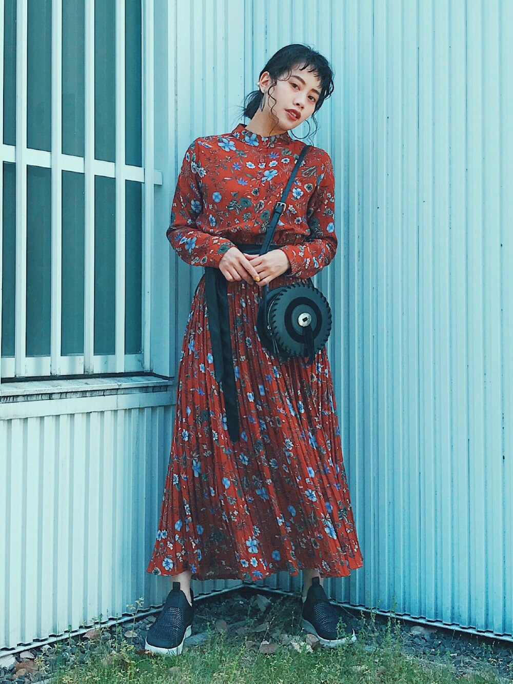 T Λ Eのワンピース「フラワーパターンプリーツロングワンピース」を使ったコーディネート