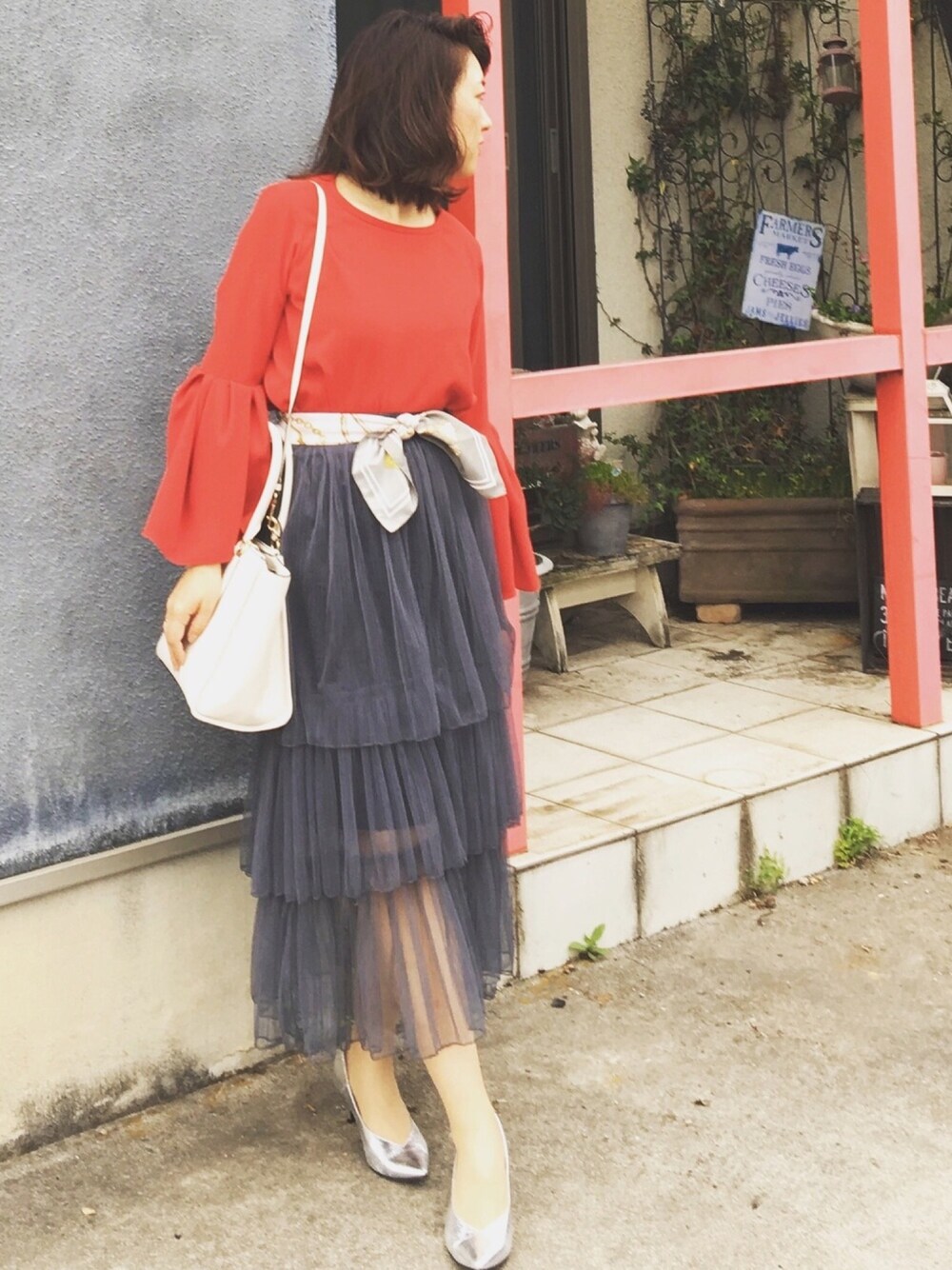 赤のベルスリーブのブラウスを主役に。 今回はスカーフでウエストマークです。