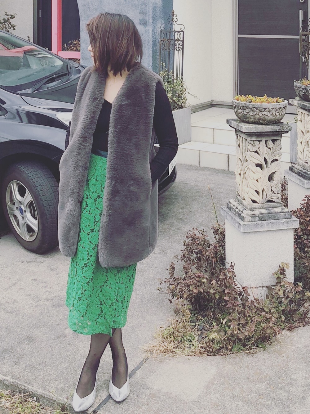 【ファージレとタイトスカートのコーデ】 オゾックのグリーンのレーススカートにファージレをトッピング。 ドレッシーに。