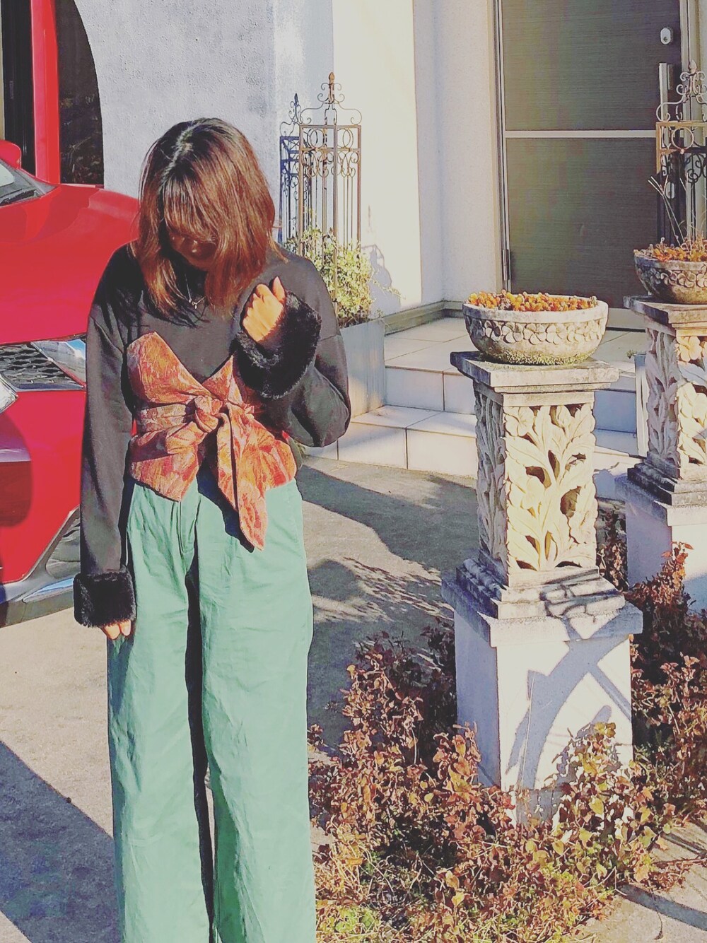 【顔タイプエレガントのカジュアルコーデ】 今日はカジュアルに。ファー付きロングTとチノパンのコーデにビスチェを足してエレガントタイプ向けにしました。