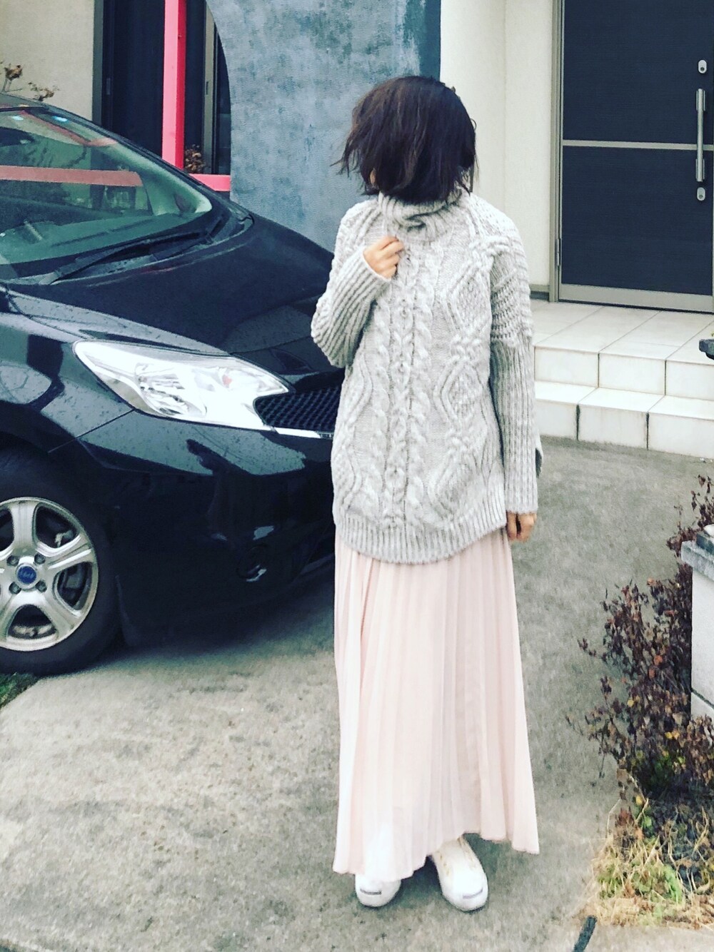 【ざっくりニットとシフォンスカートのコーデ】 昨日と違って寒いですねー! 今日は迷わずざっくりニット。シフォンのロングスカートと合わせて、ユルズルなバランスにしてみました。