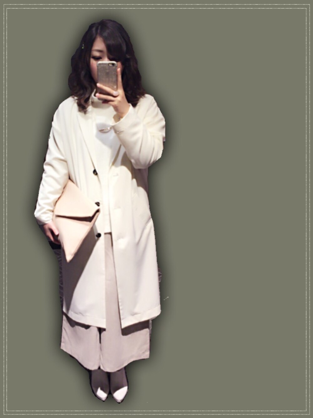 ワントーンコーデほわいとばーじょん。 髪の毛まきまきしてるんるんお洋服屋さん巡り。 こーゆーのんびりお洋服みれる時間が今はとっても幸せです。 今日わ気温がちょうどよかったので、さらっとしたアウターで。 やっぱりこのドルマンのまっちろもこもこセーターわかわゆくてすきー。 はー、映画できゅんきゅんしてストレスばいばい。★