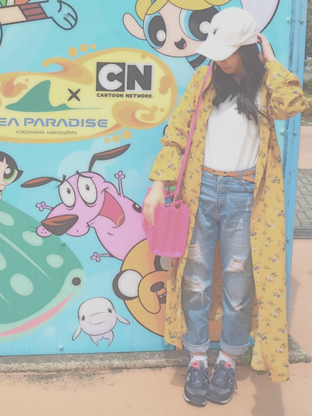 中はTシャツとパンツでシンプルスタイルにして 黄色のガウンをメインに目立つようにしました🌟 スニーカーとバッグのピンクをアクセントにしました🌸