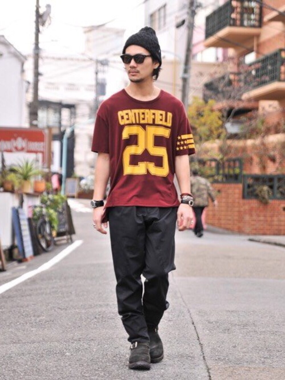 トップス:glamb(予約商品) パンツ:glamb(予約商品) ニットキャップ:glamb(予約商品) ブレスレット:glamb(予約商品) シルバーバングル:glamb レザーブレスレット:Chrome Hearts リング:TENDERLOIN アイウェア:白山眼鏡 シューズ:WESCO glamb 最新コレクションアイテムを用いたコーディネートです。