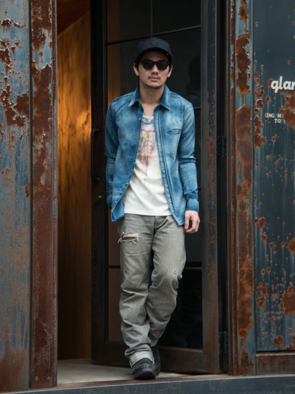 シャツ:glamb インナー:glamb パンツ:glamb×JAM HOME MADE シューズ:WESCO アイウェア:白山眼鏡 ピックアップタグが本日はデニムシャツです。でもいつもと同じ格好。