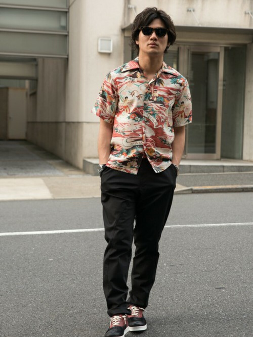 アロハシャツ:Kona Bay Wahaii × glamb パンツ:glamb シューズ:glamb アイウェア:BOSTON CLUB × glamb※glamb Tokyo店舗別注アイテム ウォッチブレスレット:fyah custom leathers Kona Bay Wahaii × glambでリリースするアロハシャツです。数多くリリースしているアロハの中で反響高い≪ランドオブアロハ≫をglamb別注カラーとして、Red、Blueの二色を展開しました。