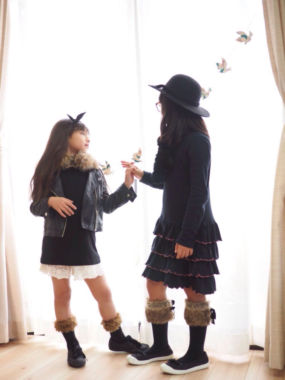 オールブラック…のつもり。 同じ歳の従姉妹ちゃんと。 女子のライダース×レースとかチュールスカートとか好きです。甘辛大好きです。でも硬いとか動きにくい、重いってリアルではなかなか活躍しないので我が家では何年も前に古着で買ったguライダースさんで十分のようです…女子はコンパクトで短め丈のがかわいくて許されるからよかった!
