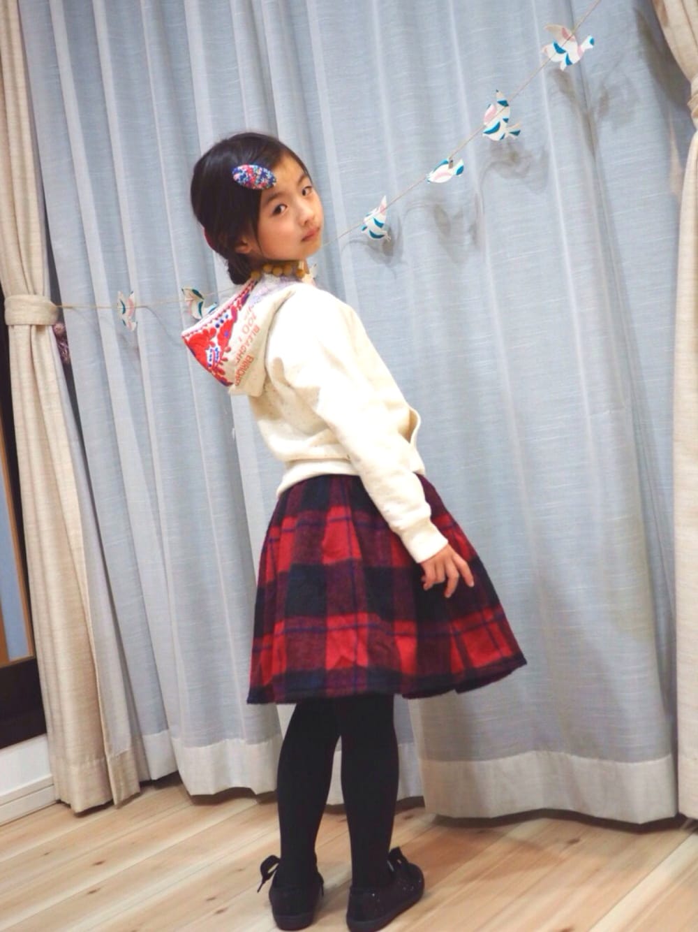 プティマインのチェックスカート (中にズボンあり) 冬は赤のチェックが絶対 欲しくなるのです。 スカッツにしては長めの丈と ふんわり広がるきれいなラインが 文句なしにかわいいです! スカートを主役に、他はシンプルめで。 こちらは表地が起毛で、深いきれいな赤なのがいいですね。黒の太チェックに薄っすら細いネイビーのラインが混じるのもいい色味(^-^) ポケット二つあるので登園登校にも使いやすそう。 120でスカッツは130着用