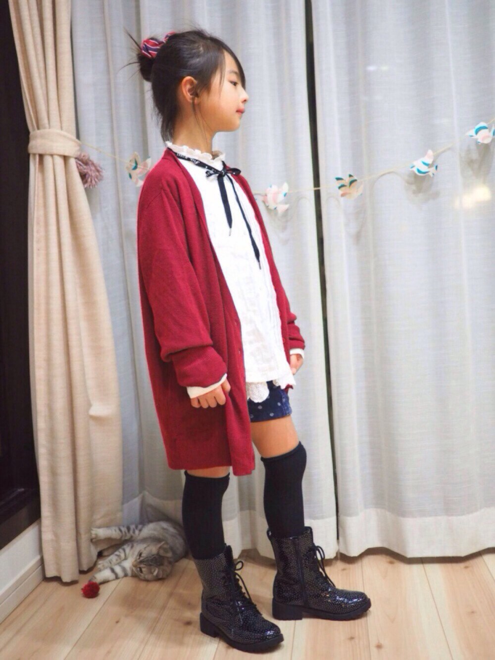 #ワインレッド 本日のタグってボジョレーヌーヴォーの解禁日だから?!今気づいた! 大人カーディガンで ロングカーデ風。 白のレースブラウスに英字が書かれた飾り紐でアクセント。見えてないけどヘアゴムもGTHのレジメン生地のチョウタイで、スクールガールを意識して。個人的にはボトムとニーハイとの距離はもう少し詰めたいところ。ナントカ領域というやつですな。