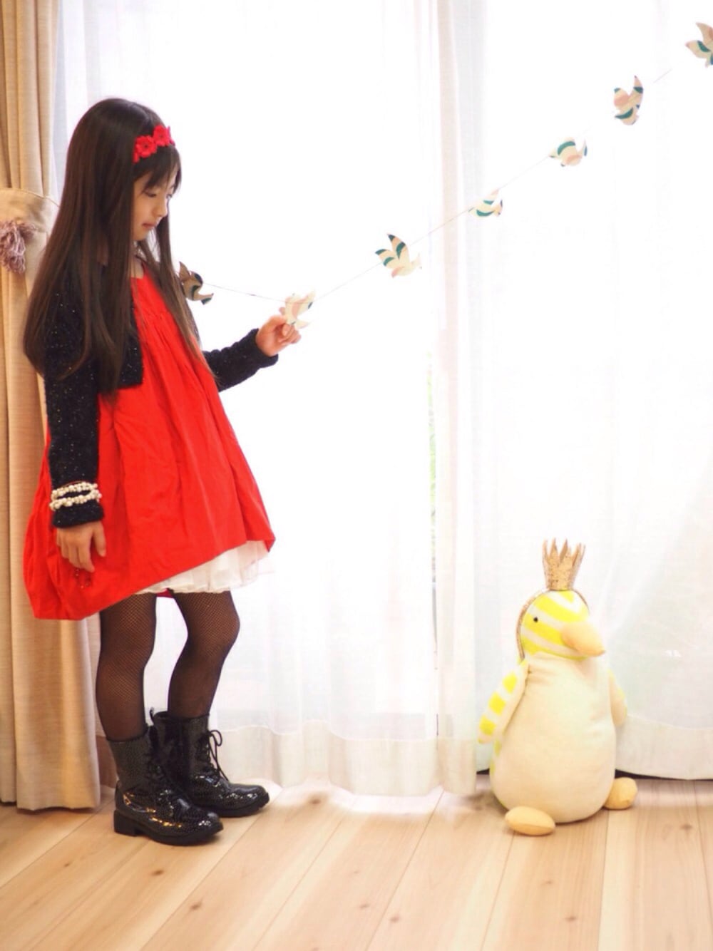 #パーティスタイル #ZARA 大好きなフランキーグロウの 真っ赤なワンピは ここぞという時に(^-^) Mだと丈短くなっちゃったのでパニエ入れて。網タイツ。パーティというかピアノの発表会コーデともいいます。 swapの花レースを重ねたヘアバンドはネックレスにもなるもの。普段はこのペンギンさんぬいぐるみにつけてあります(笑)キラキラ冠カチューシャはZARAといえば!のお約束アイテムで、お誕生日に活躍ですが重くてずり落ちやすいので実用性ゼロという。でも好き。