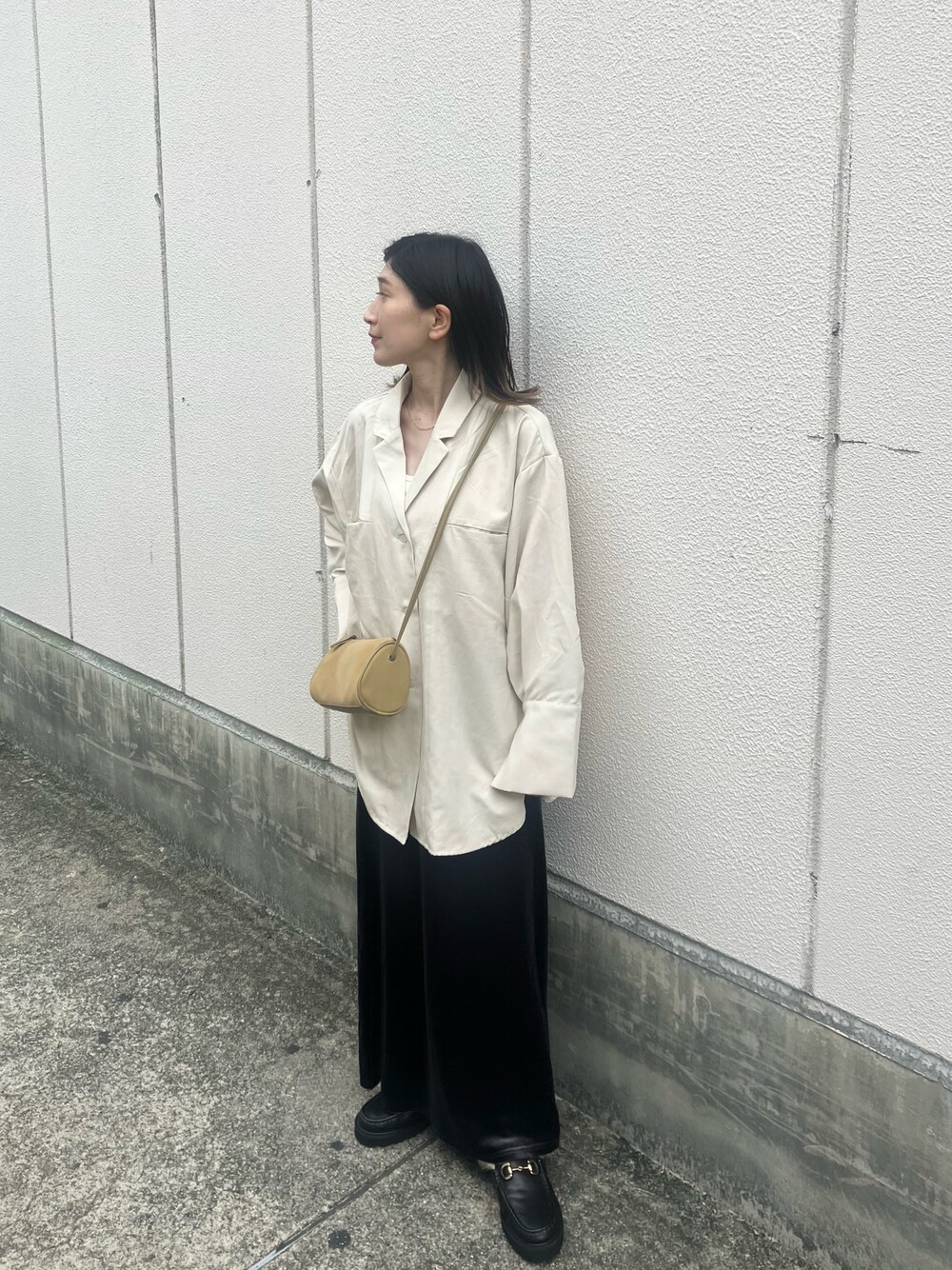 オーバーサイズのシャツにタイトスカートを合わせてバランスよく!!シャツはジャケットみたいな襟なのでおしゃれ感が増すアイテムです!!