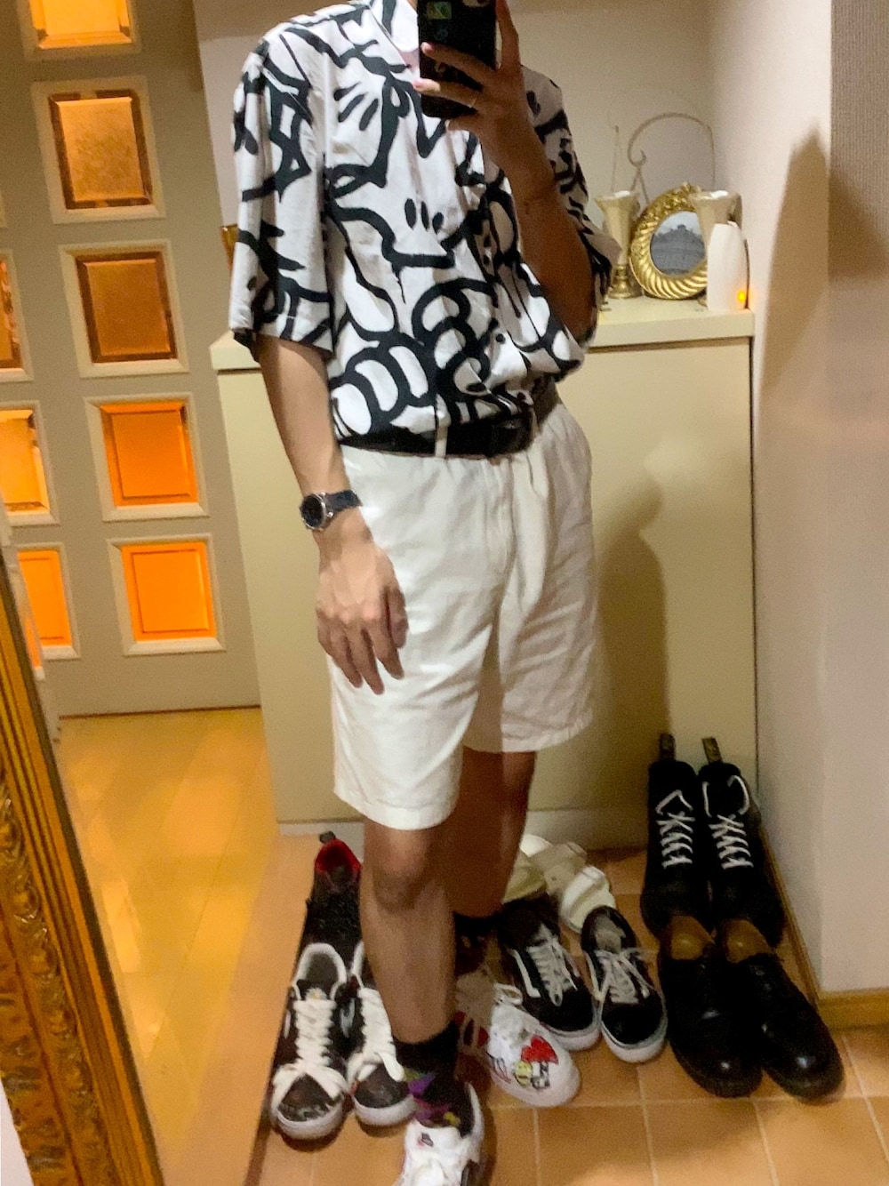 足元以外は白黒でまとめたモノトーンコーデ◻◼ トップスはミッキーの手が沢山書かれた可愛い柄シャツ 袖が5分袖くらいなのでオーバーサイズに着れます! パンツはシンプルな白のハーフパンツで爽やかさUP⬆️ 足元は派手めに🤩🤩🤩 ハイソックスの柄がとても可愛いSTANCEのソックスにペイントしたAirforce1を合わせました🙆🏻♂️ *足元の靴は気にしないでください🥺 Photo spot by MyHouse🏠