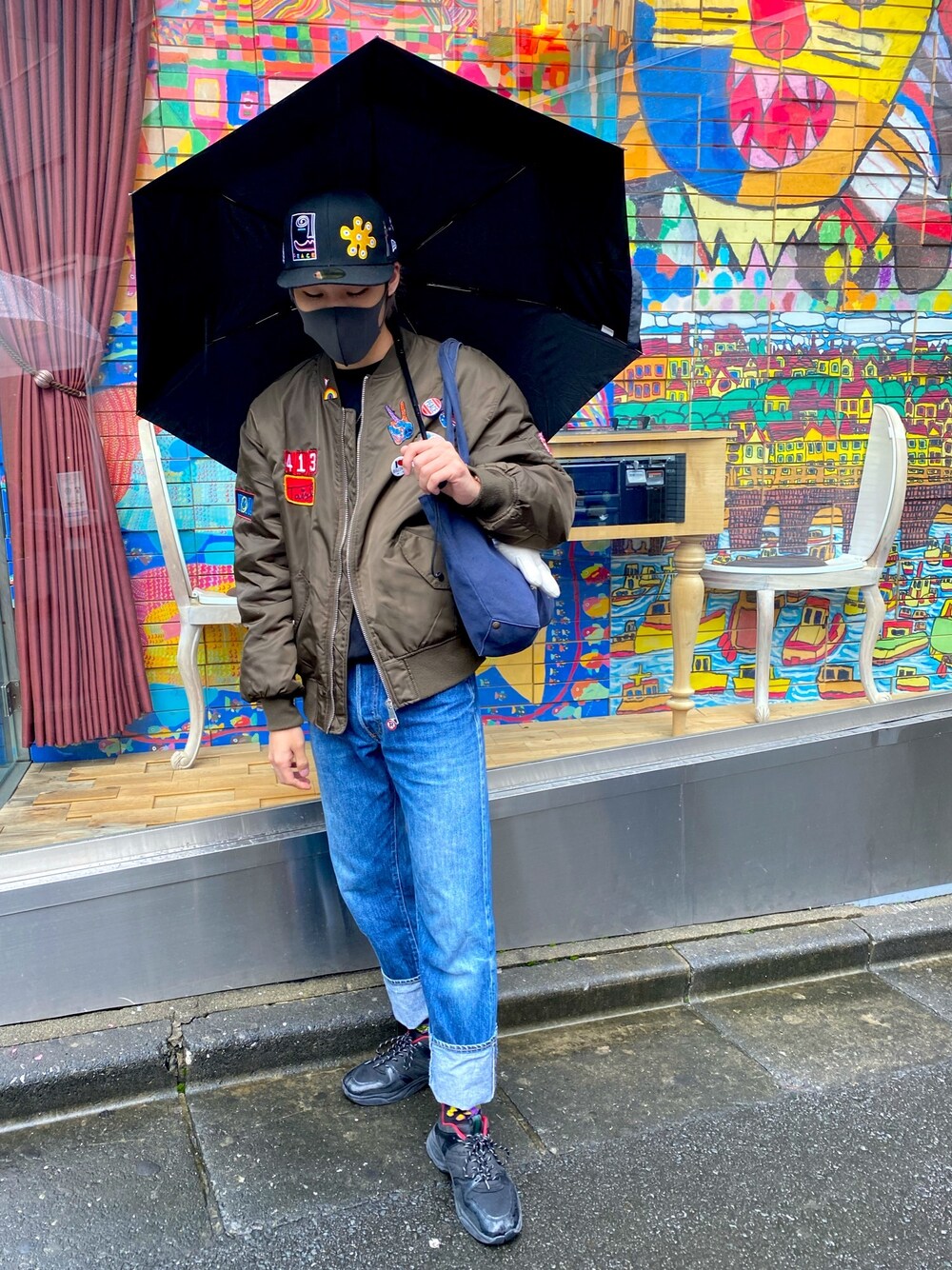 雨の日の休日スタイル🎃 トップスは黒のスウェットをきて アウターでカスタムMA-1を着ました🙆🏻♂️ 全部自分でつけたのでとてもお気に入りです✨ パンツはDIESELさんのジーンズで、緩めで裾を大きくまくり上げてソックスが見えるようにしました🙆🏻♂️ 靴下はSTANCESOCKSさんのスナックが描かれた靴下です🧦 シューズはGUさんで購入したダッドスニーカーです👟 黒と赤で合わせやすいデザインです😋 Photo spot by Harajuku🍭