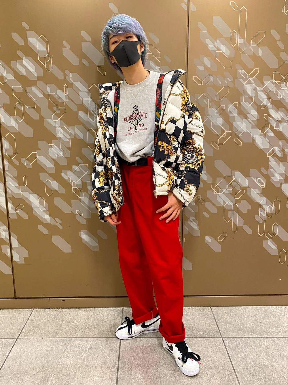 派手派手コーデ笑 トップスはグレーのスウェットに サスペンダーをつけました。 これはどちらも古着屋さんで買ったものです😊 アウターは派手派手で高そうに見えますがForever21さんなのでプチプラです👍🏻 暖かくてお気に入り😙 タックインしてベルトがちらりと見え、 パンツも古着屋さんで購入したDickiesさんの赤いパンツです🍎 これがまたアクセントが効いてかっこいい! シューズはバチバチにかっこいいパラノイズです! 今回は禿げるのがはやいなぁ。 Photo spot by Shibuya🤳