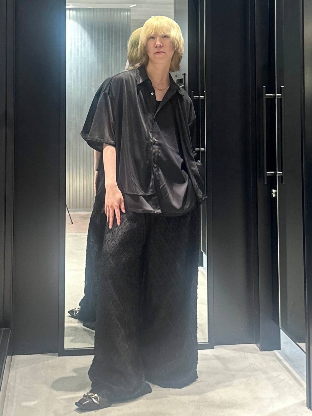 174/58 シャツ → ポリエステルとレーヨンを織り交ぜた薄手の生地の上から、シアー素材を重ねたレイヤードデザイン! 一枚で様になるデザインで色々な着方ができるのも魅力的です✨️✨️ パンツ →毛足の長い、シャギー素材を使用したデザインパンツ。 幅をかなり広く持ったワイドシルエット。リラックスして着用でき、一枚で存在感抜群です! 程よい透け感のある薄手な生地で夏は快適に着用できます✨ 🥀Instagram (@taigawed)🥀