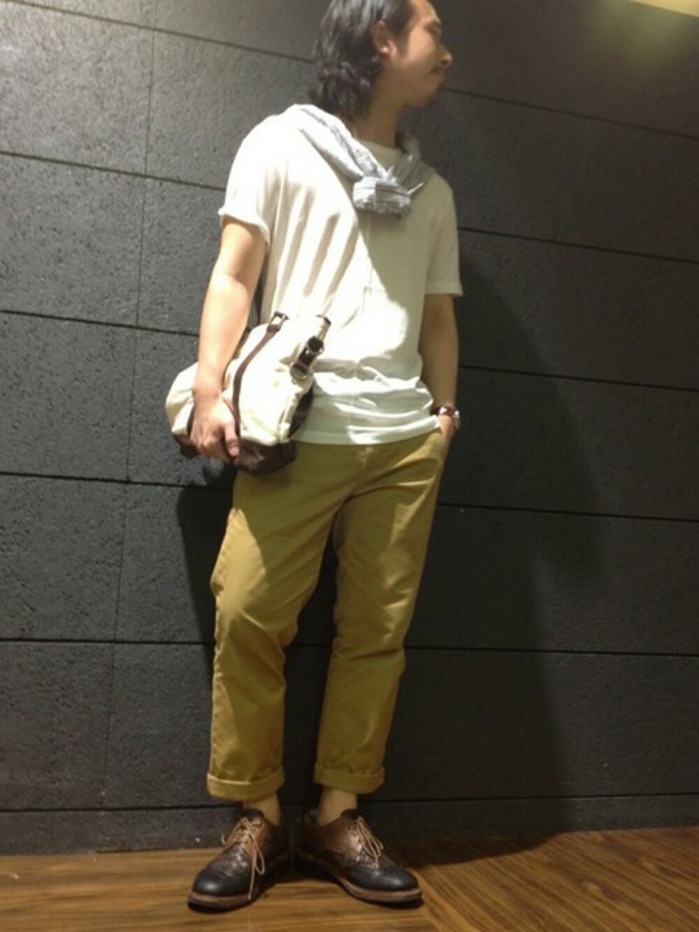 夏っぽくシンプルなコーディネート。 シャツやバッグでのワンポイントが、アクセントに!
